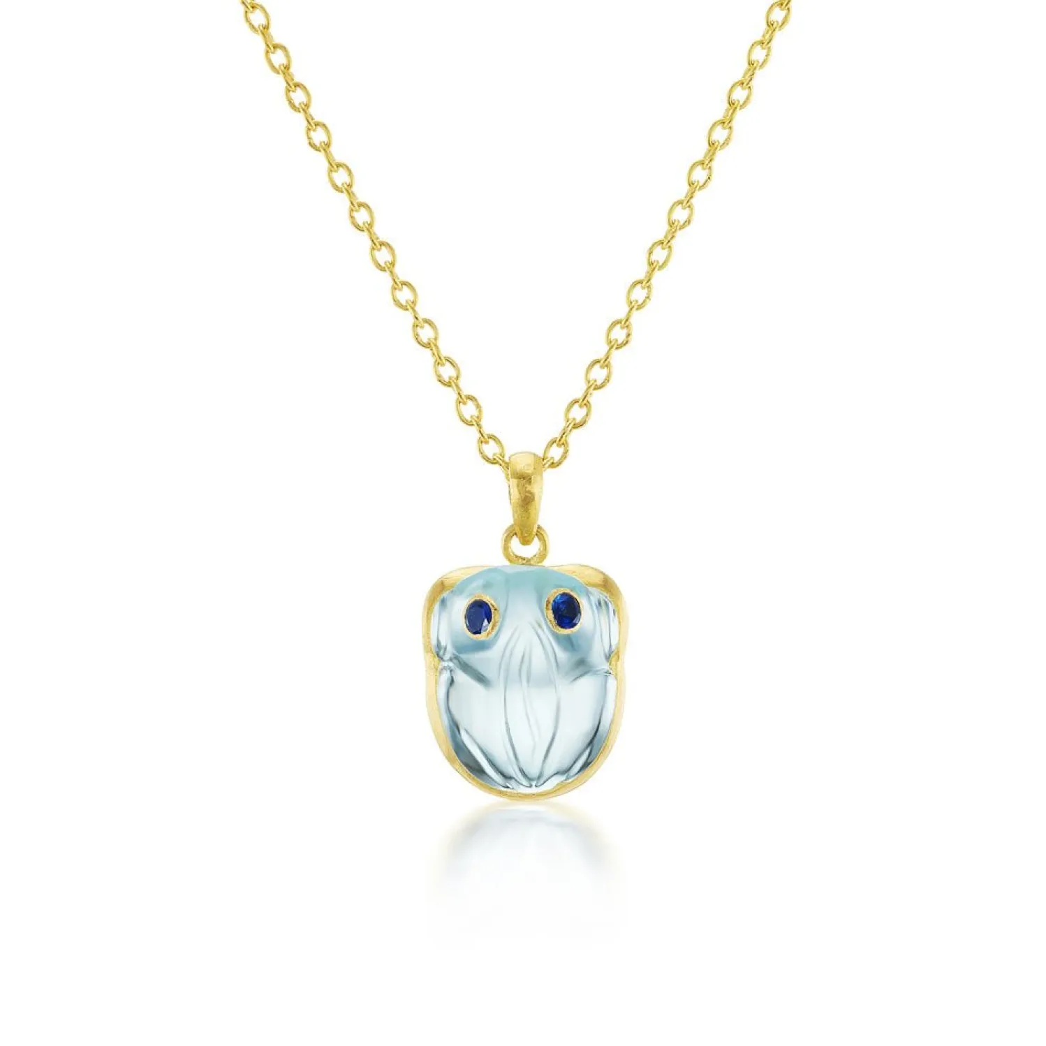 Stone frog pendant with gemstone eyes on an adjustable length yellow gold chain.