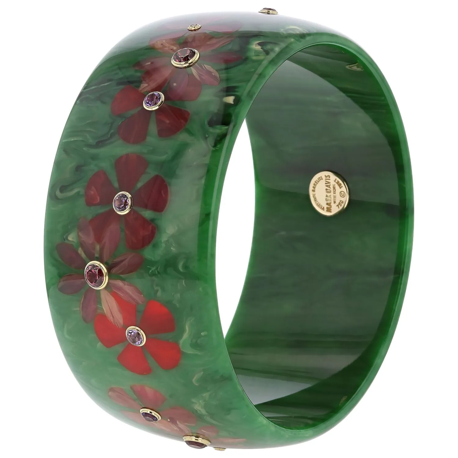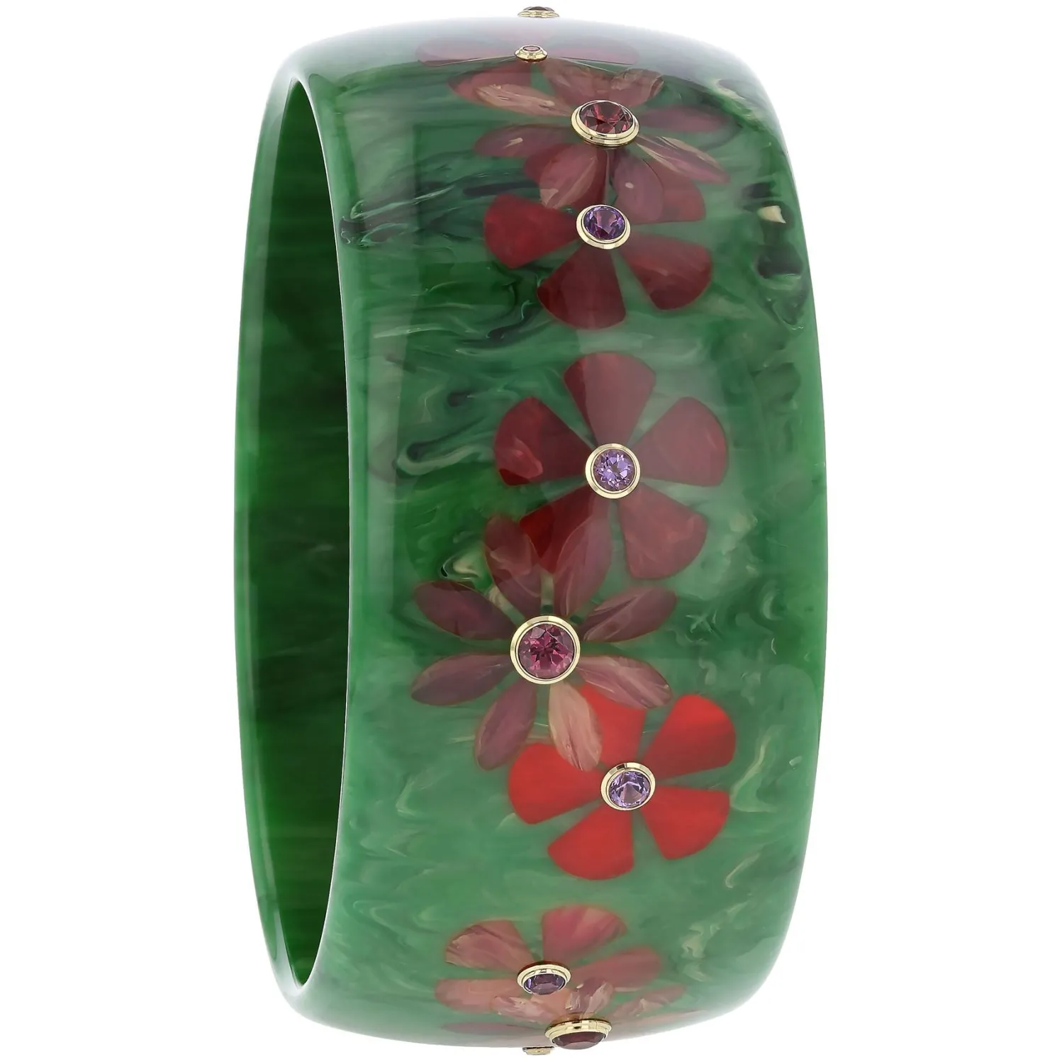 Mark Davis Vintage Bakelite Bangle with Flower Inlays and Amethyst and Rhodolite Garnets set in Yellow Gold. Each Mark Davis Piece is One-of-a-Kind and Sustainably Produced in South Carolina.