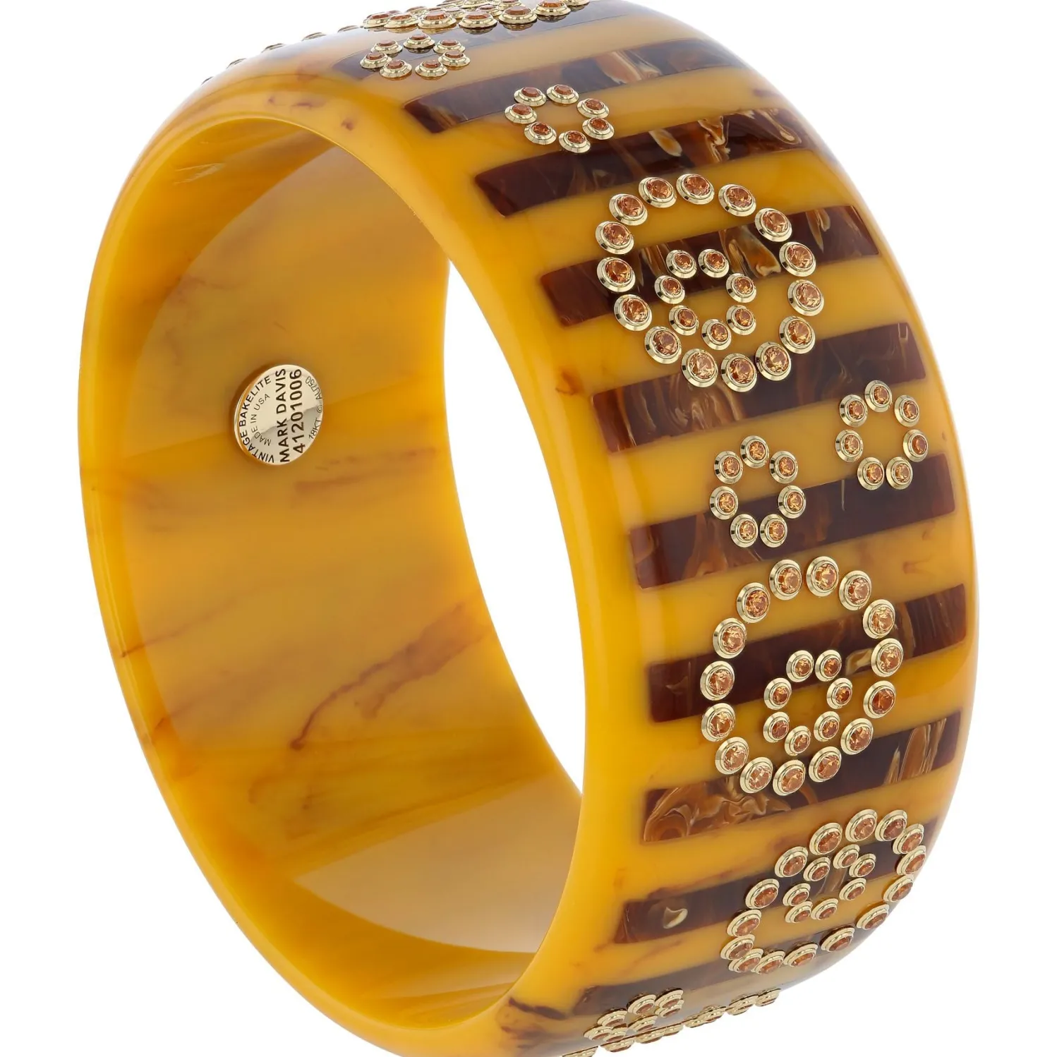 Mark Davis Vintage Bakelite Bangle with Striped Inlay Detailing and Bursts of Citrine set in Yellow Gold. Each Mark Davis Piece is One-of-a-Kind and Sustainably Produced in South Carolina.