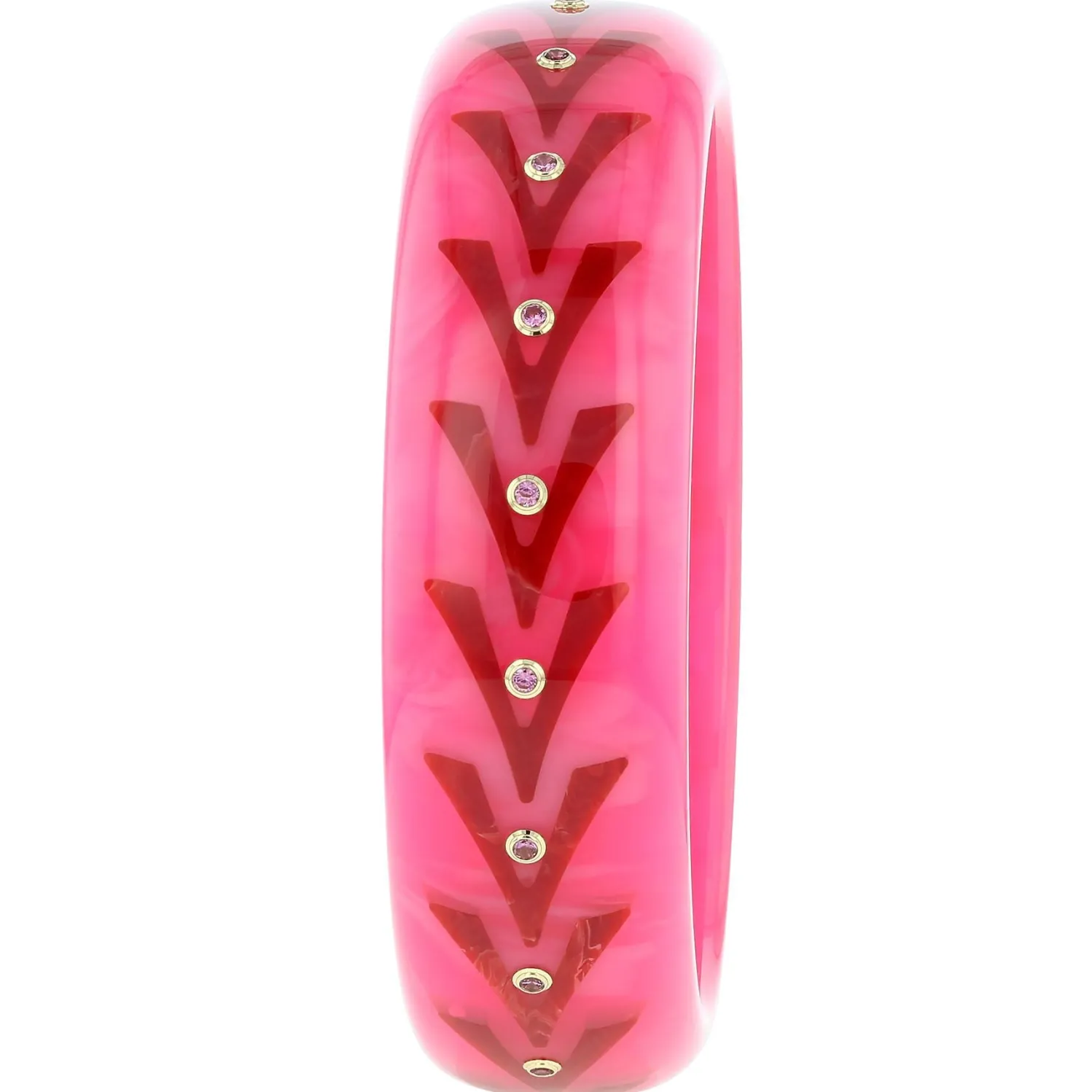 Mark Davis Vintage Bakelite Bangle with Arrow Shaped Inlay Detailing and Rhodolite Garnet set in Yellow Gold. Each Mark Davis Piece is One-of-a-Kind and Sustainably Produced in South Carolina.