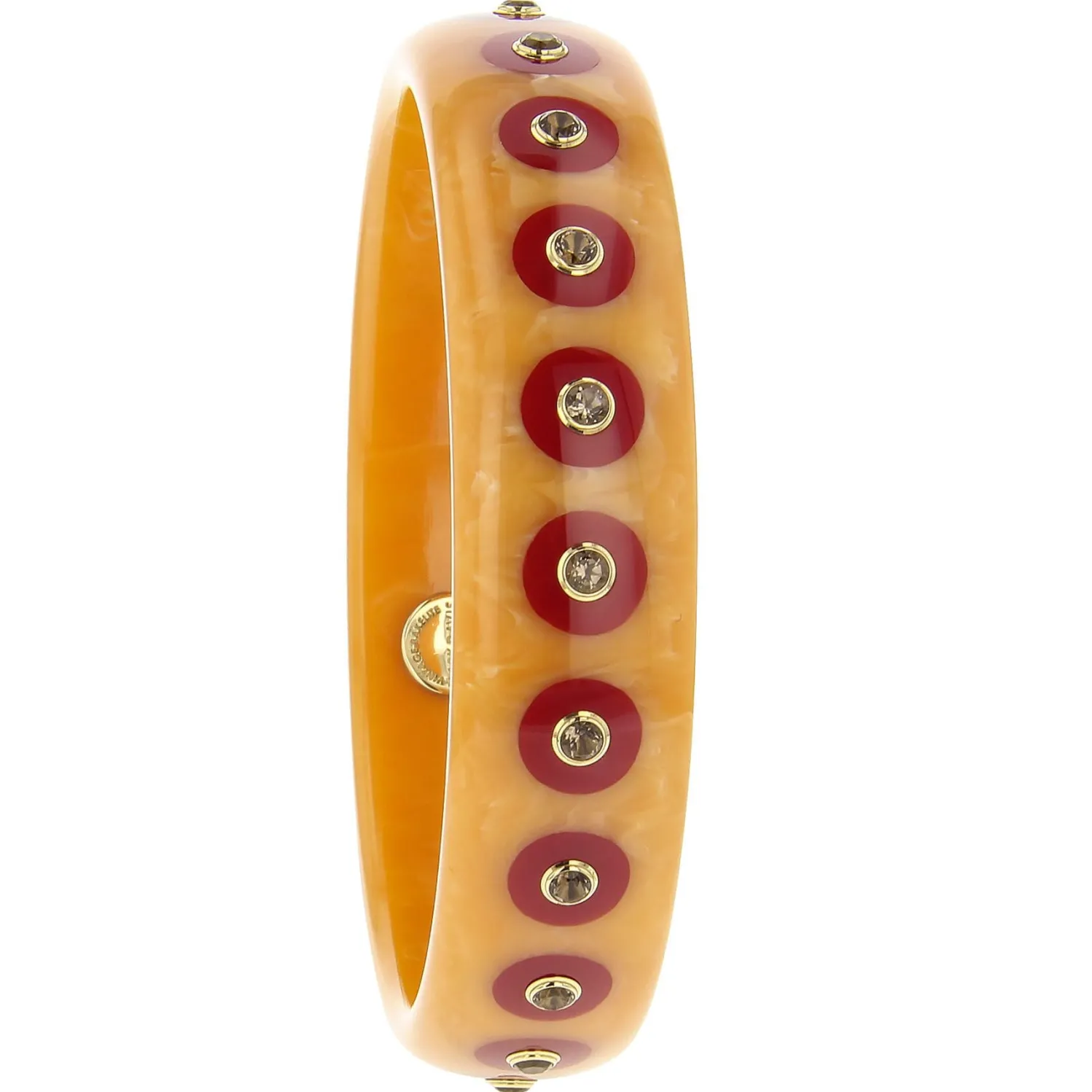 Mark Davis Vintage Bakelite Bangle with Circular Inlay Detailing and Smoky Quartz set in Yellow Gold. Each Mark Davis Piece is One-of-a-Kind and Sustainably Produced in South Carolina.