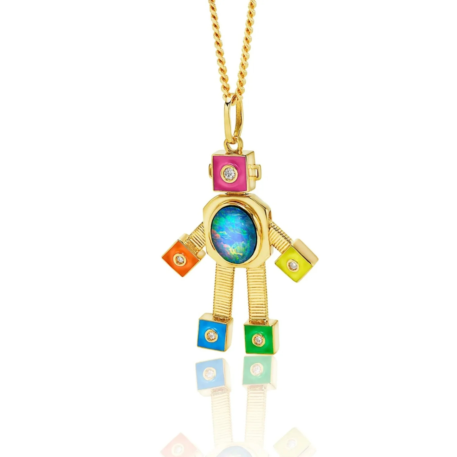VAN ROBOT Mini Heart Robot Pendant with Black Opal, White Diamonds and Enamel. Hidden Internal Mechanisms Inside the Dancing Robot’s Stomach Enable the Head, Hands and Feet to Move Separately, While also Working as a Whole. Heart Engraved on Reverse.