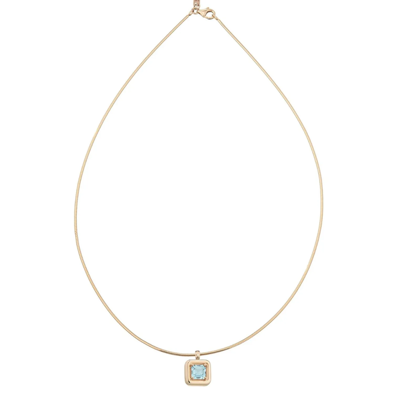 Bea Bongiasca necklace in yellow gold featuring a square cut blue topaz pendant set in yellow gold.
