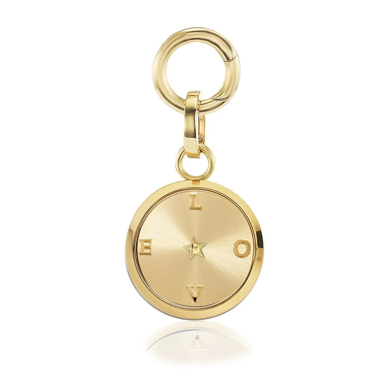 Carpe Diem LOVE pendant with ticking center star, golden sunray face and 2 openable clasps.