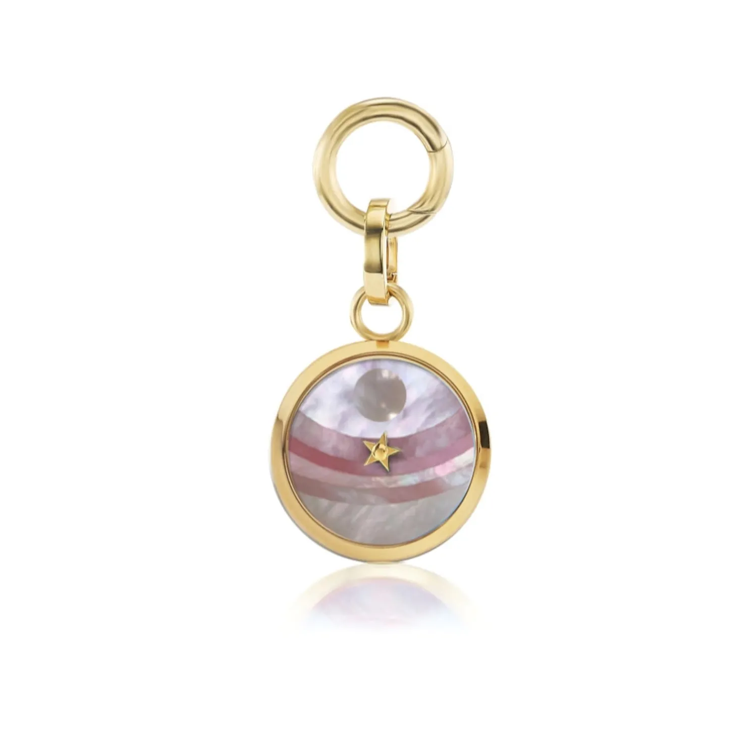 Carpe Diem pendant with ticking center star, pink painted mother-of-pearl moon mosaic and 2 openable clasps.