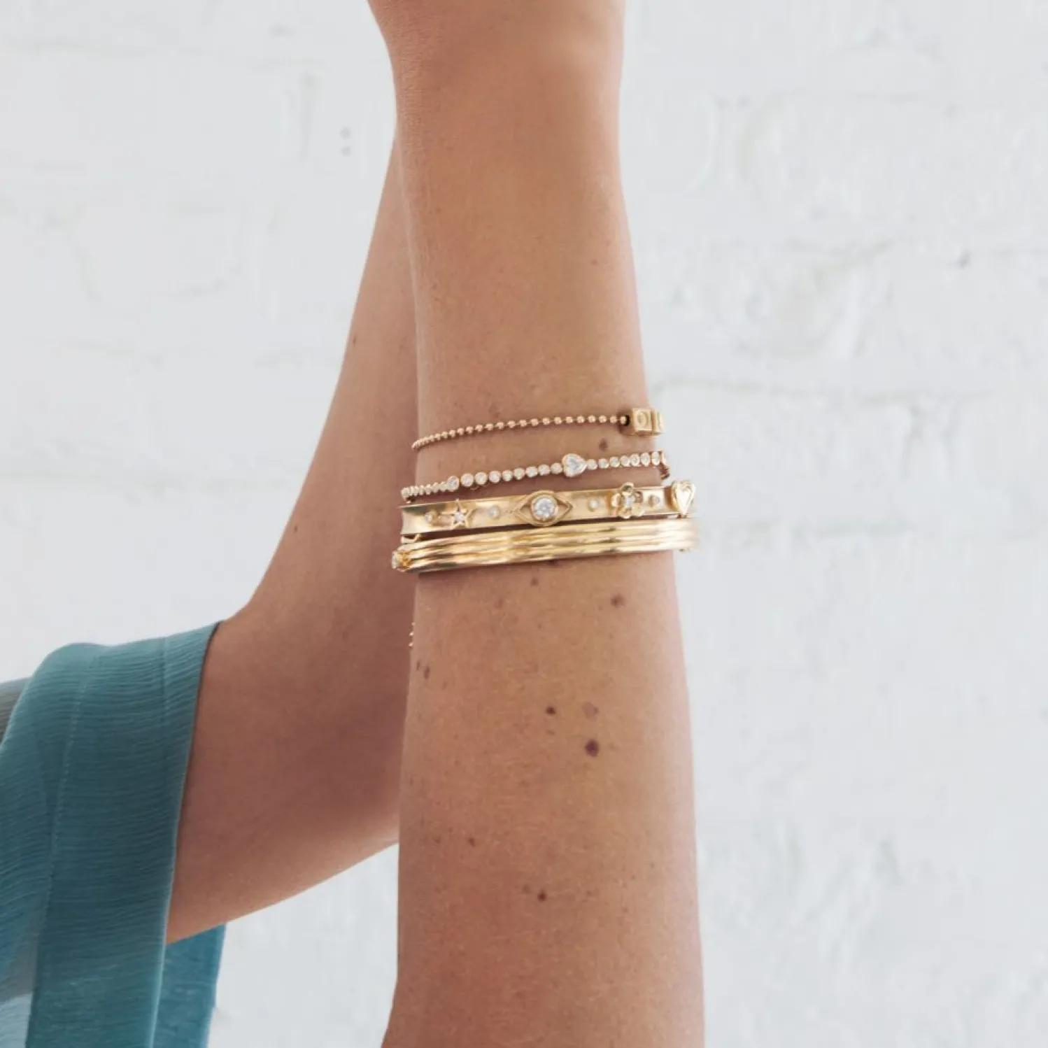 Charming cuff bracelet with eye, heart, and star shapes embellished with white diamonds.
