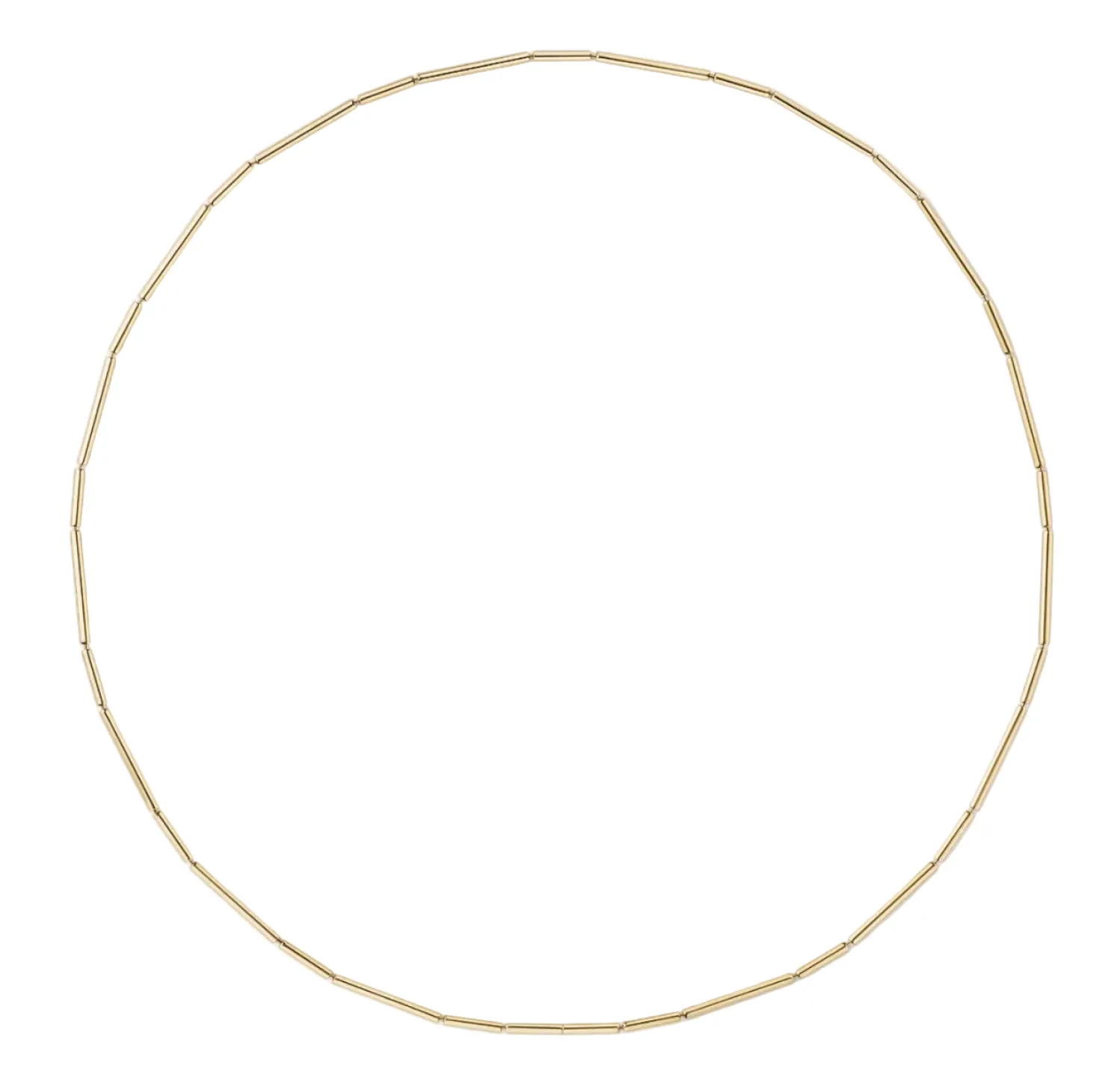 Shihara Tubular Bead Chain Necklace with alternating 2cm and 1cm gold tubes. Each bead is linked with a ball-and-socket configuration making for fluid and sturdy construction. Screw-like Closure. Made in Japan.