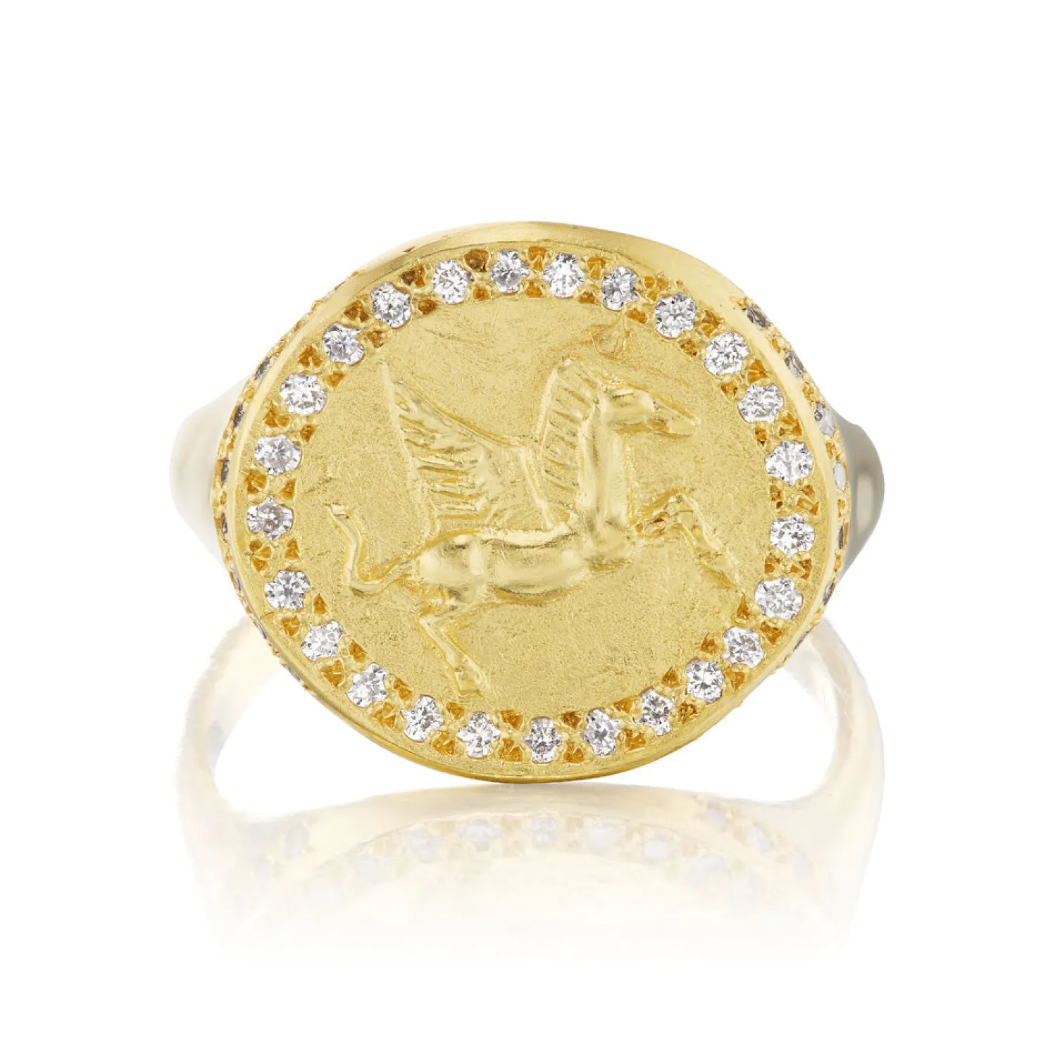 Christina Alexiou Champagne Diamond Pegasus Coin Ring in Yellow Gold. The Pegasus represents inspiration, creativity, freedom, and transcendence.