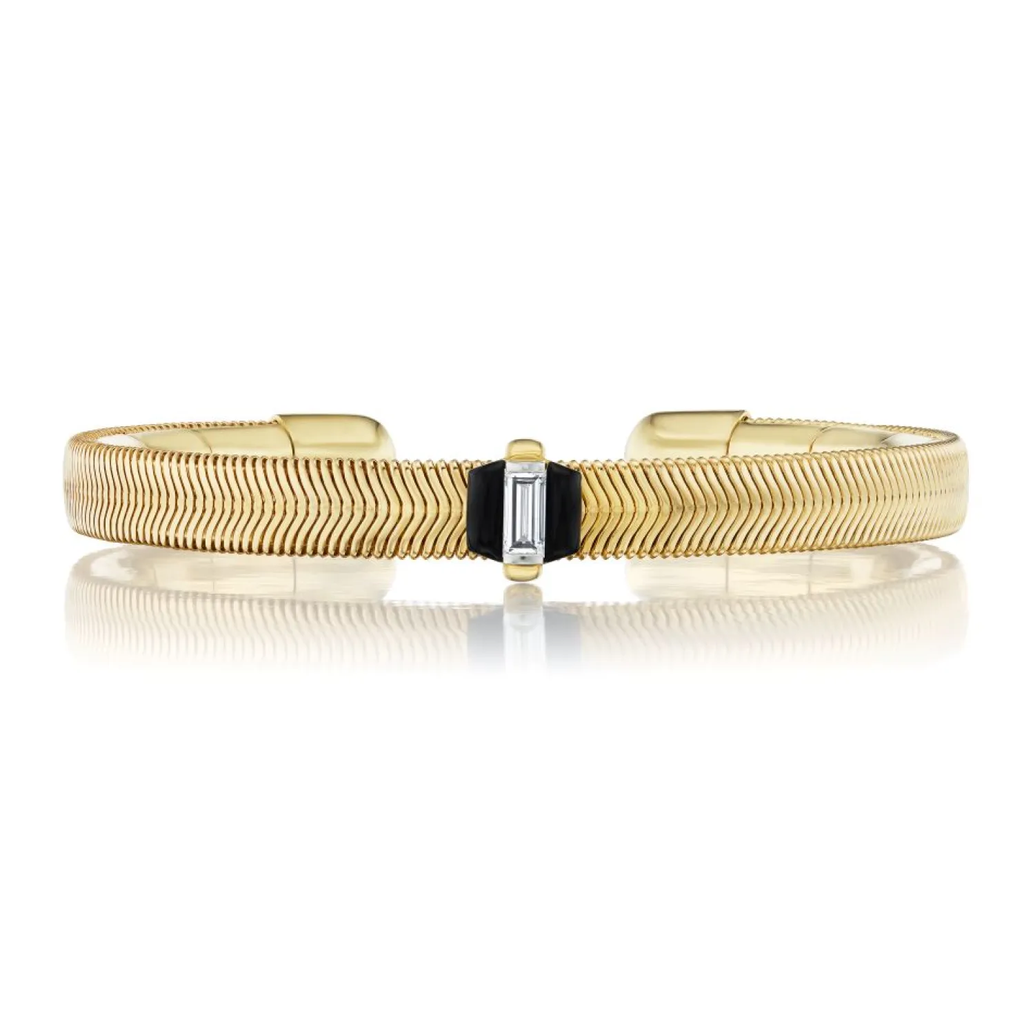 Yellow gold chain open cuff bracelet with black enamel and baguette white diamond.