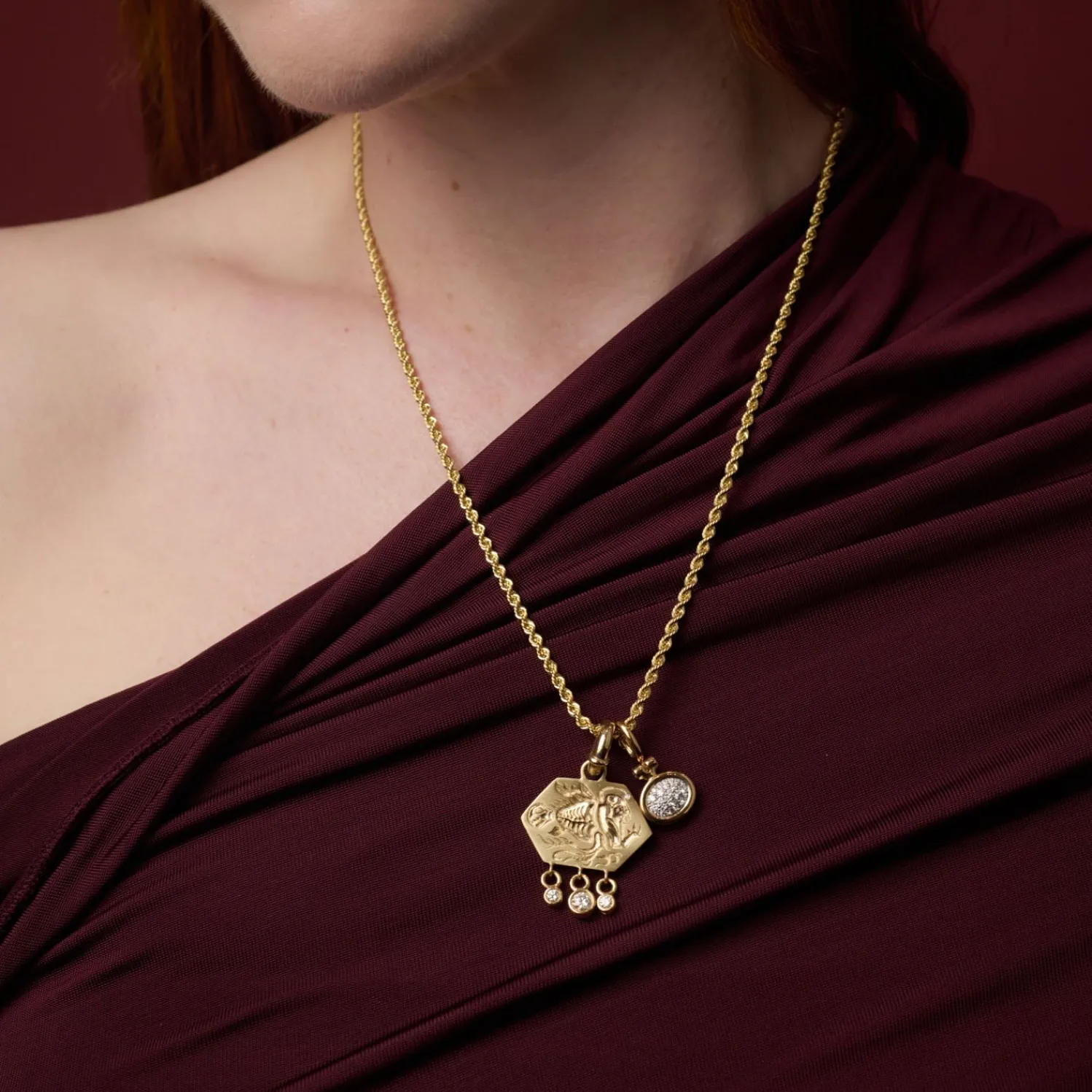 Castro Smith Fish Cold Wonda Charm. 9k yellow gold engraved hexagon charm adorned with 18k yellow gold mini diamond charms.