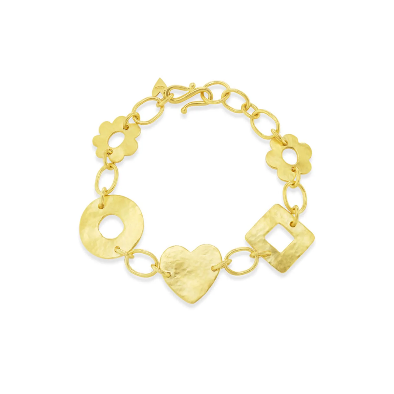 Yellow gold chain link bracelet with hand-crafted satin finish daisy, circle, diamond, and heart-shaped hammered links and an s-hook closure.