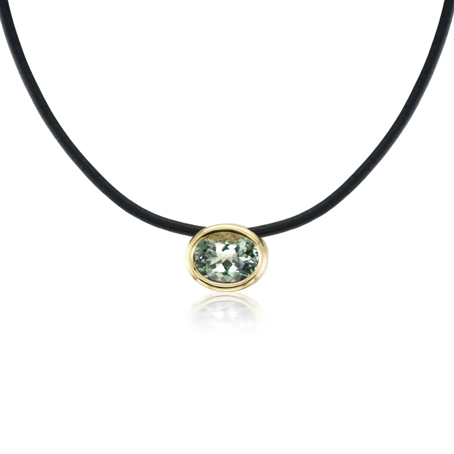 BECK Scuba Choker with Oval Cut Green Amethyst on Black Leather Cord and Yellow Gold Cord.