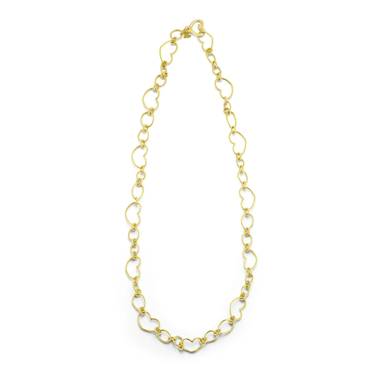Christina Alexiou Chain Necklace with Heart and Oval Links Handmade in yellow gold with slightly hammered finish. Hearts Vary in Size, Largest 0.78″