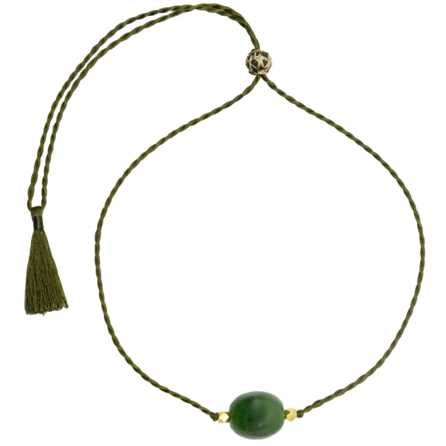 Iaia Caravan Chota Cord Necklace in Jade. Large Jade bead on an adjustable silk cord with Faceted gold beads.