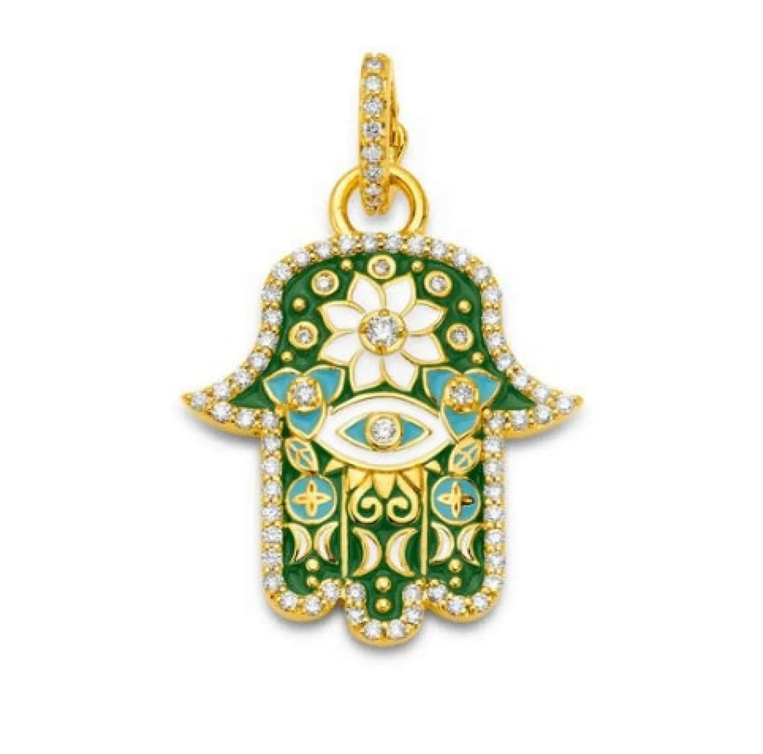 Buddha Mama Kelly Green Enamel Small Hamsa Pendant with Diamonds and white enamel detailing. Openable diamond bale.