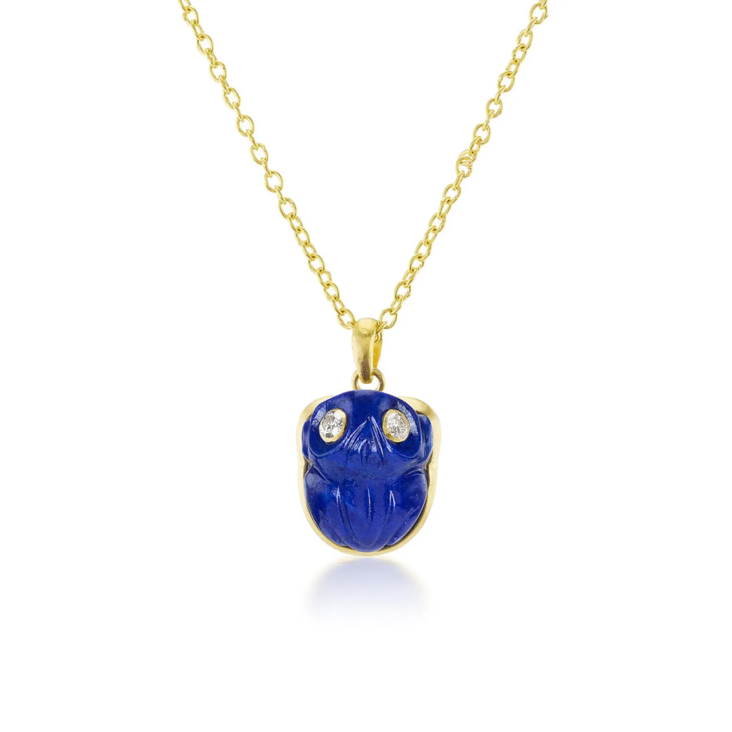 Stone frog pendant with gemstone eyes on an adjustable length yellow gold chain.