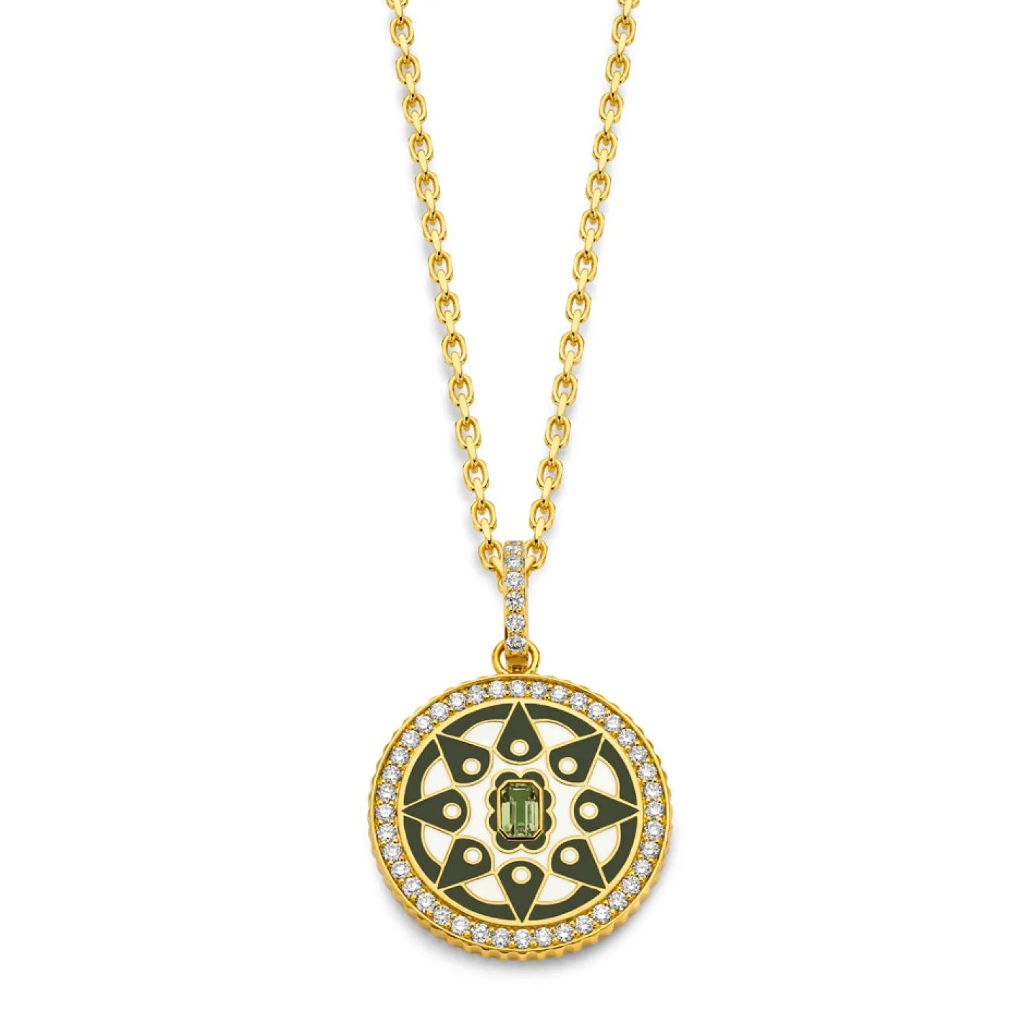 Yellow gold circular mandala pendant with enamel, tourmaline, and diamond details and openable diamond bail.
