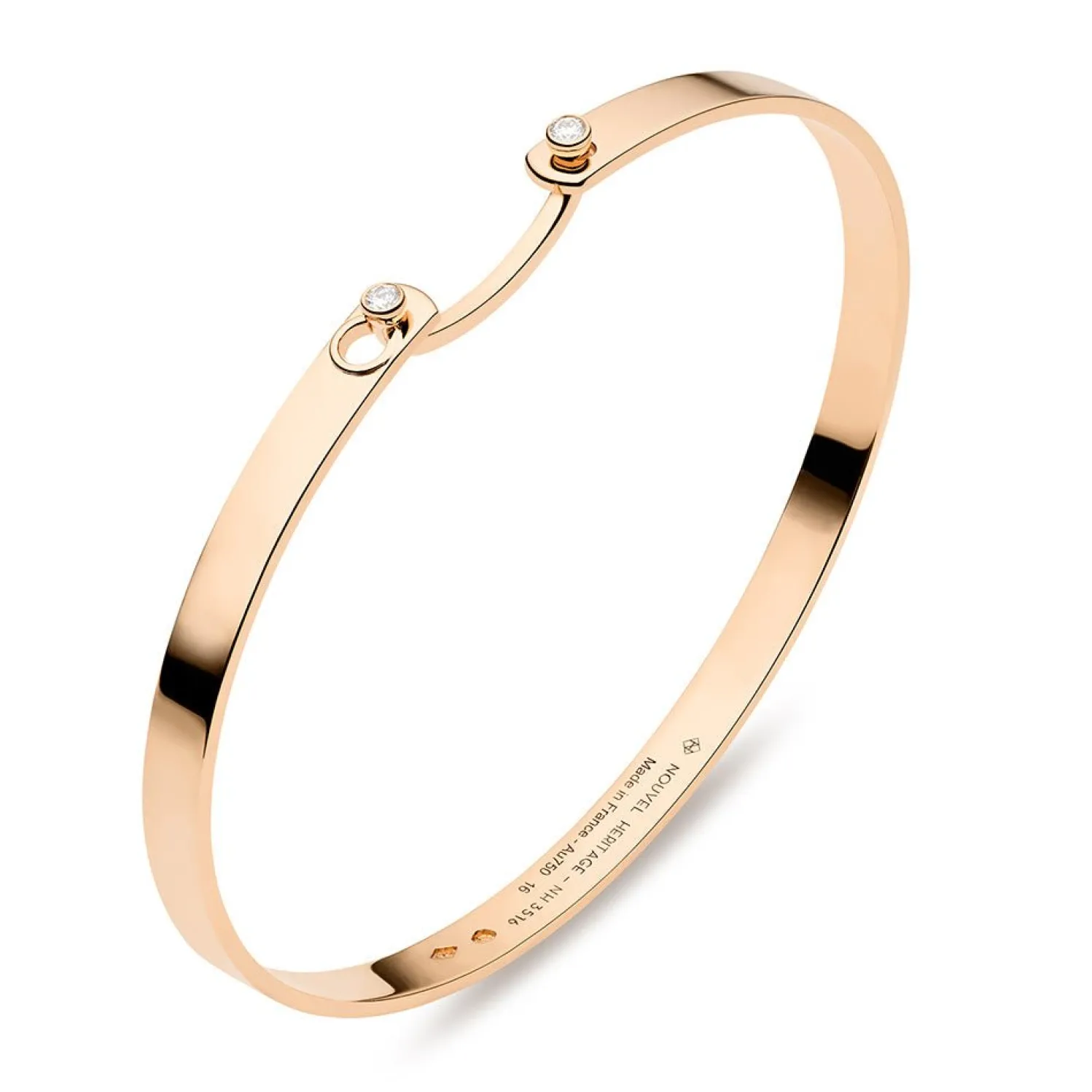 Solid rose gold bangle with two round diamonds and squeeze-to-open latch clasp.