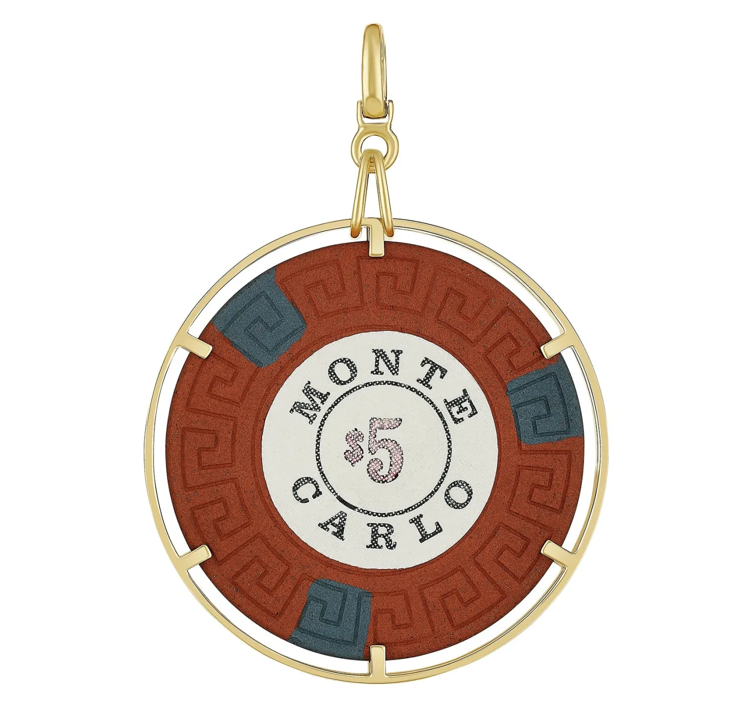 Francesca Villa “Monte Carlo” Chip Pendant in Yellow Gold. Part of Her Money Go Round Collection. Openable Bail, Open Design on Back and Front to Allow you to See Both Sides of the Chip. The Monte Carlo was in Operation from 1996 to 2016 in Las Vegas.
