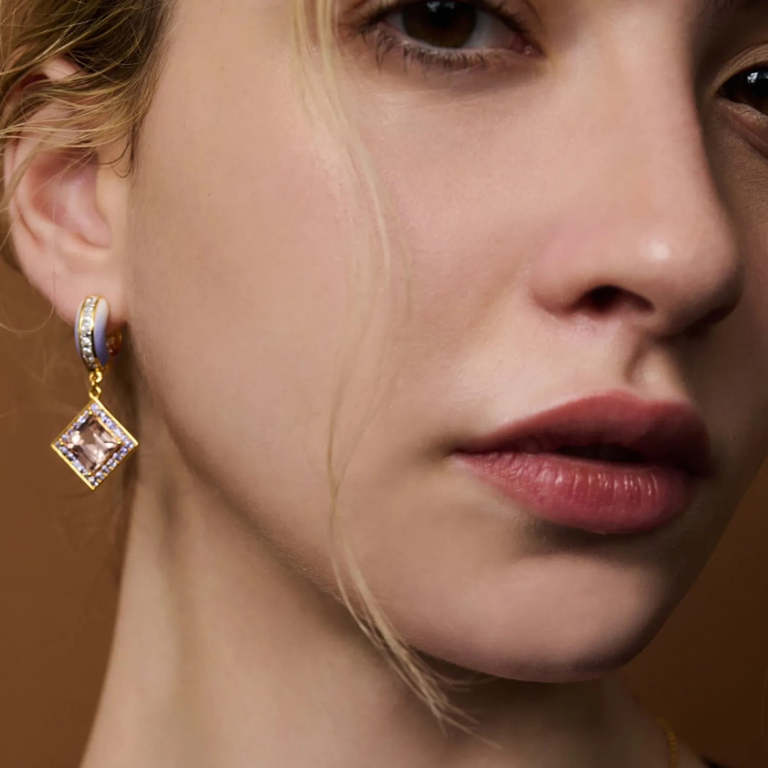 Buddha Mama hoop earrings with Morganite & Tanzanite square drop and Diamond & periwinkle enamel huggie hoop. Snap closure. Sold as a pair.