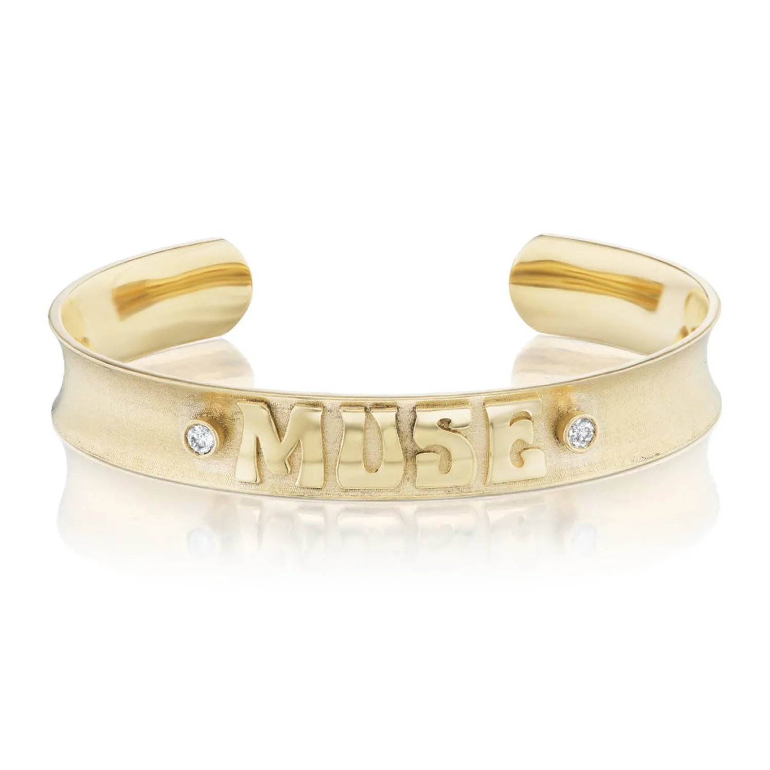Cuff bracelet with “MUSE” lettering, and white diamonds.