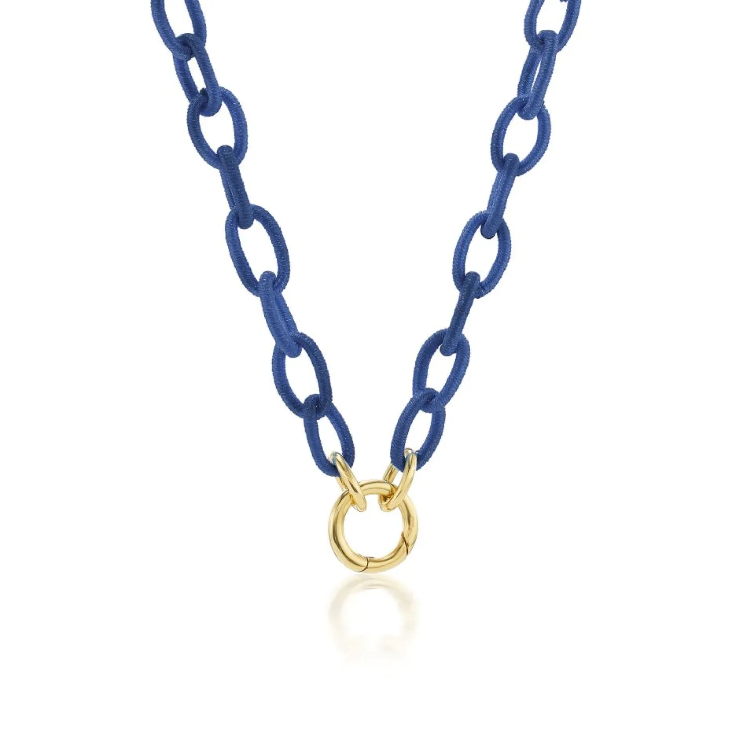 Anna Maccieri Rossi Navy silk thread wrapped chainlink necklace with double openable clasp and openable charm catcher in yellow gold.