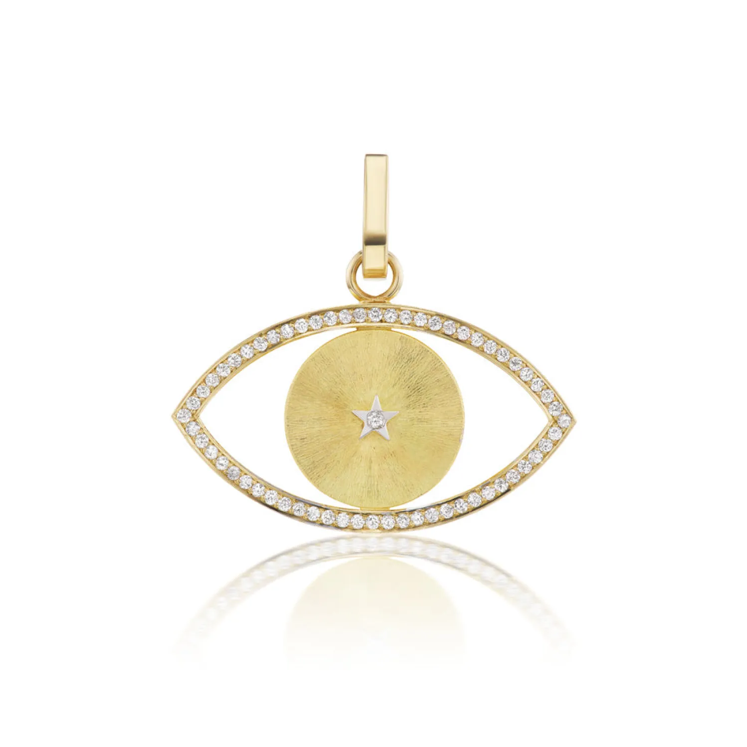 Silk finish yellow gold eye charm with white diamond outline and white gold with diamond star center. Clasp included.