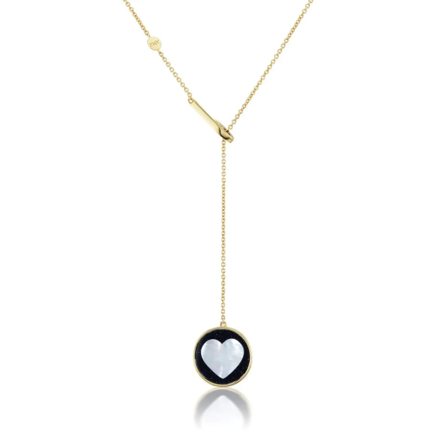 Adjustable lobster clasp placement pendant necklace with mother of pearl heart on midnight glass background.