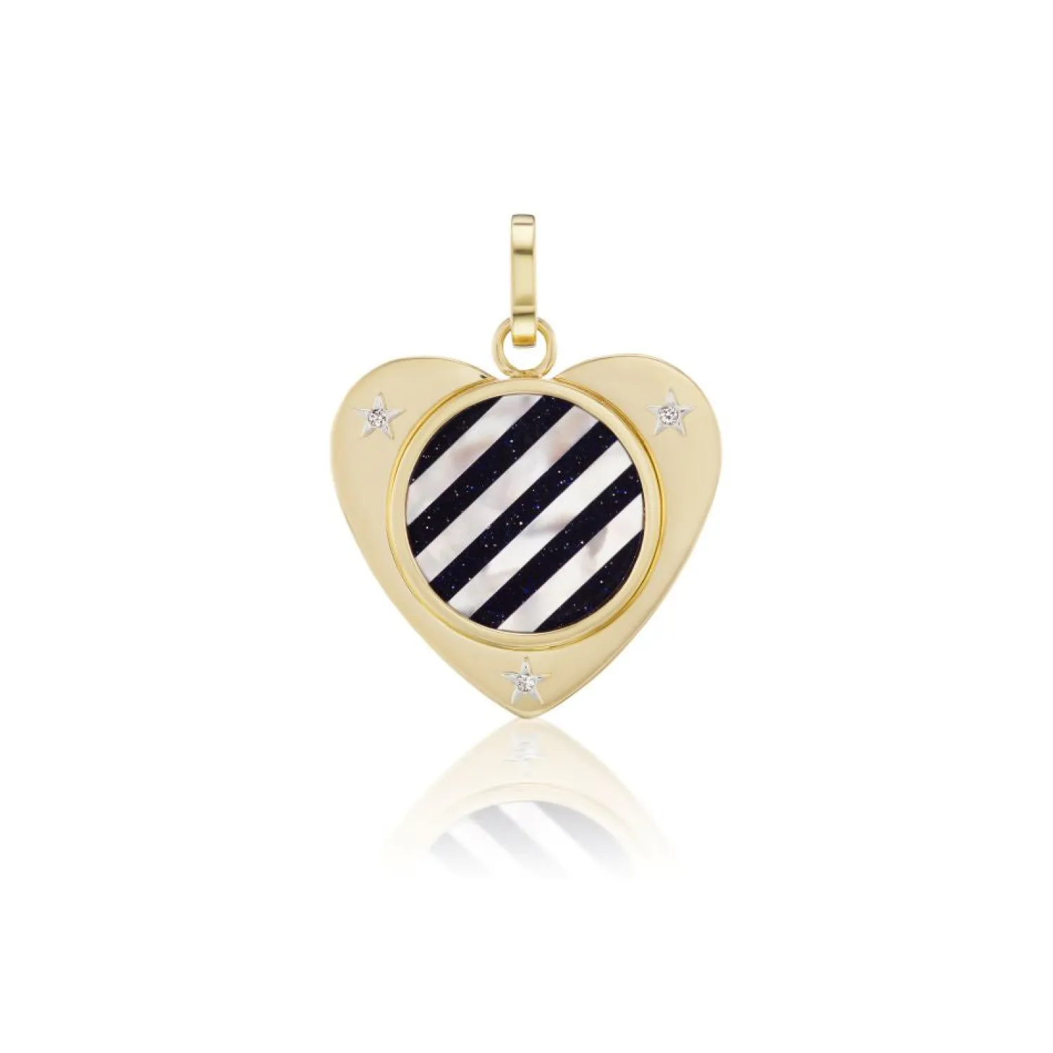 Yellow gold heart charm with mother of pearl and aventurine striped center and white gold with diamond star details. Openable clasp.