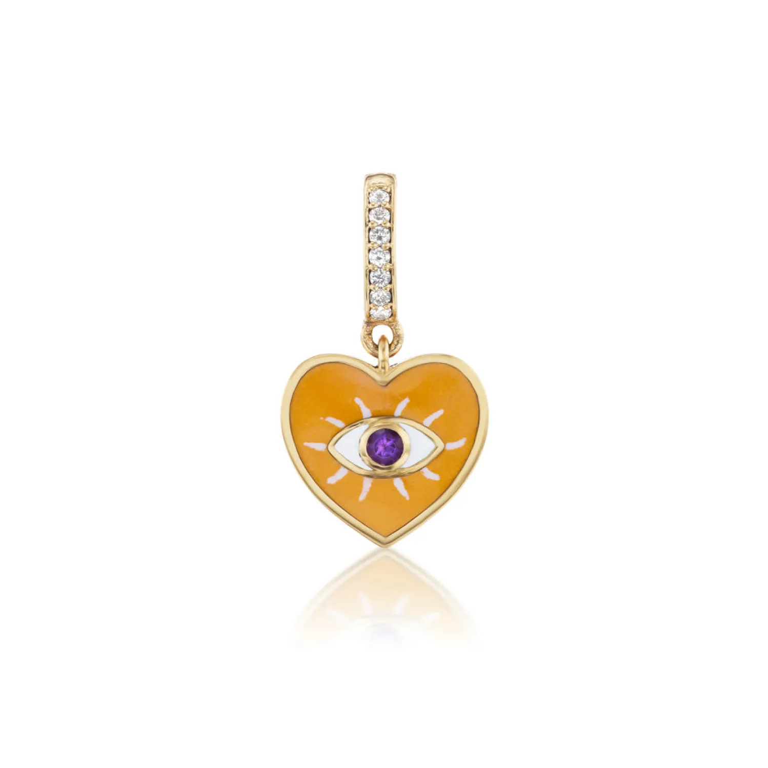 Enamel heart charm with center amethyst eye with a white diamond-lined clasp.