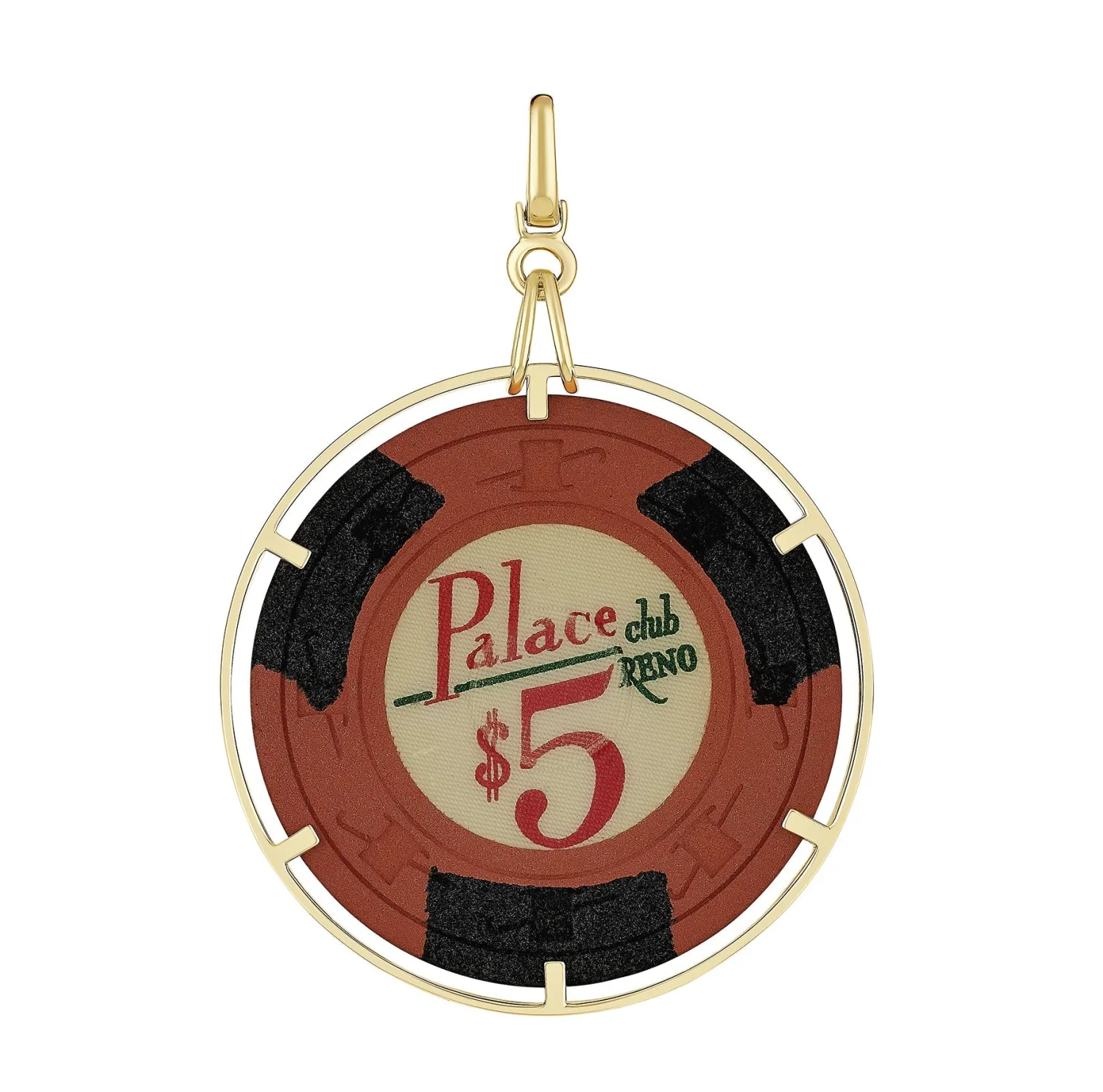 Francesca Villa “Palace Club Reno” Chip Pendant in Yellow Gold. Part of Her Money Go Round Collection. Openable Bail, Open Design on Back and Front to Allow you to See Both Sides of the Chip. The Palace Club Was one of the First Casino’s in Nevada, and One of the Oldest.
