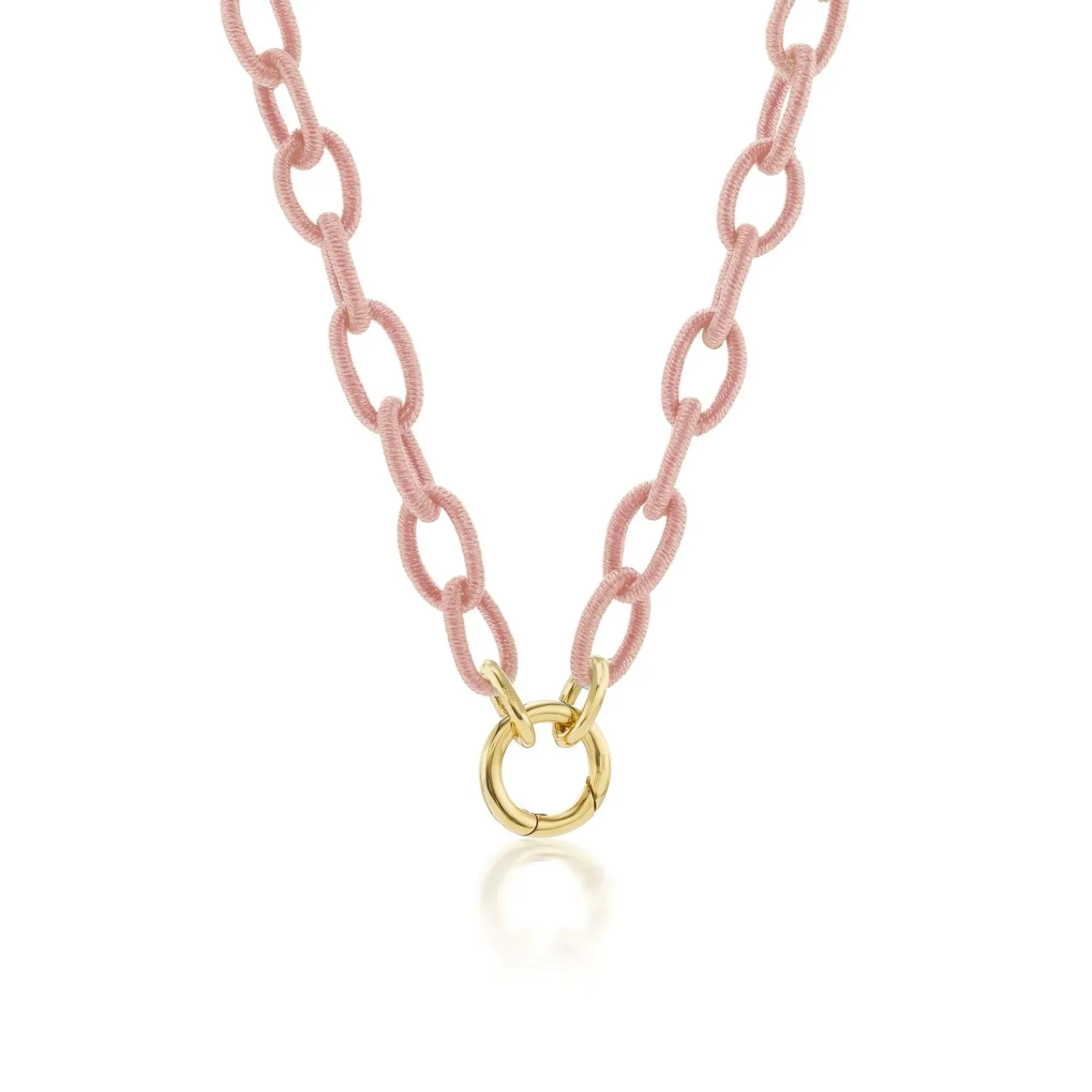 Anna Maccieri Rossi Pale Pink silk thread wrapped chainlink necklace with double openable clasp and openable charm catcher in yellow gold.