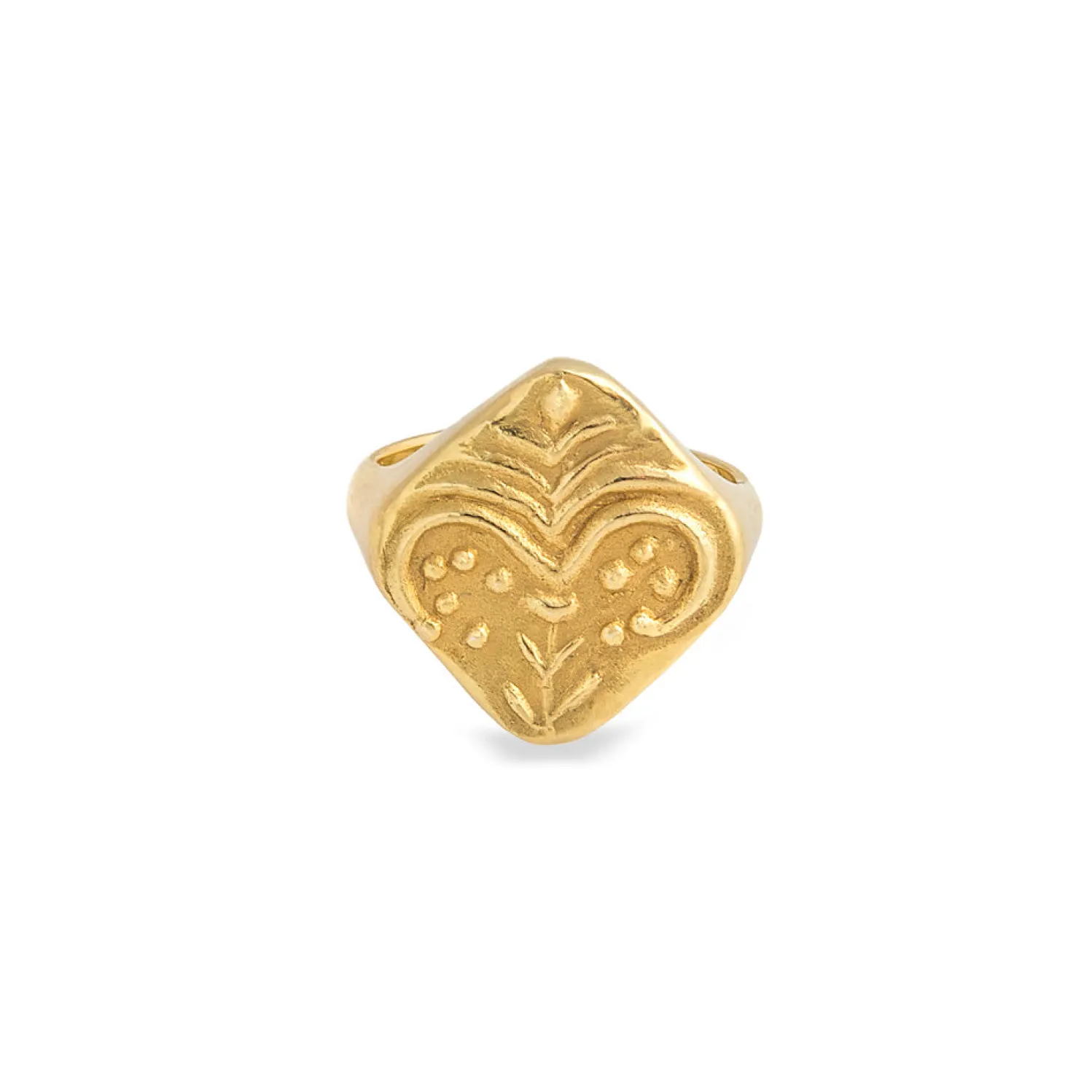 Christina Alexiou Hand crafted rhombus yellow gold ring with Greek palm frond. The Ancient Syrian city of Palmyra was a crucial oasis hub of the ancient world for many centuries. Representing resilience and wealth.