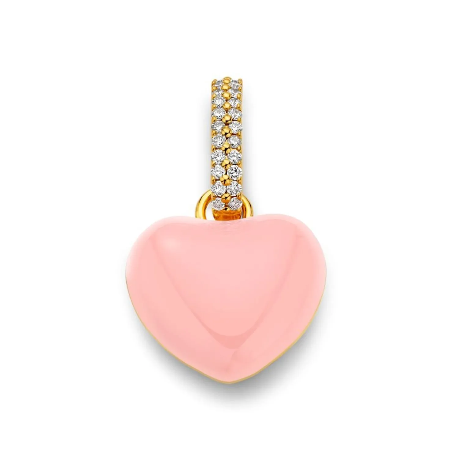 Buddha Mama Yellow Gold Heart Charm with Light Pink Enamel Front, Polished Back, and Diamond Bail. Chain not included.