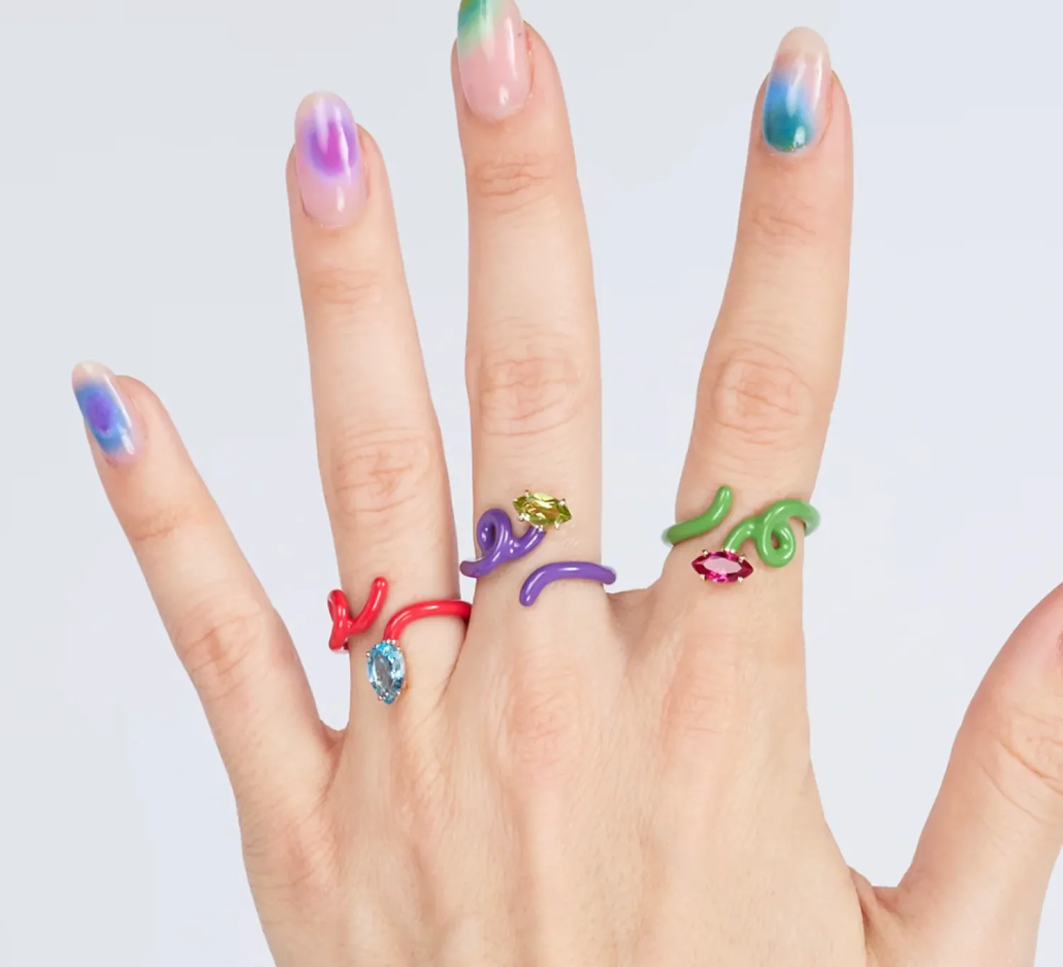 Bea Bongiasca Baby Tendril Vine Ring in Hand-painted Purple Enamel with Marquise Cut Peridot.
