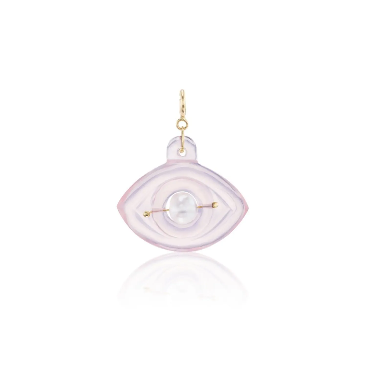 Ten Thousand Things hand-carved evil eye charm in Rose Quartz with a suspended White Pearl center bead. Available exclusively in-store and online at MUSExMUSE.