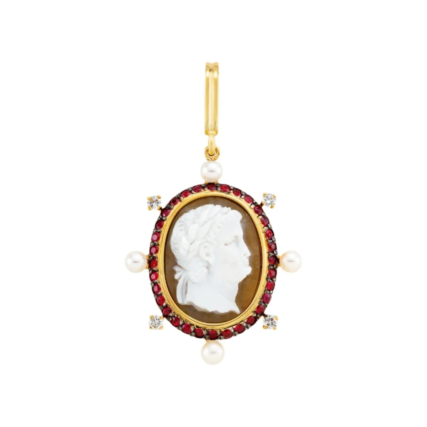 Mellerio Precious Cameo Charm with hand-carved Shell Cameo, white Diamonds, Pearls and Rubies with openable bale.