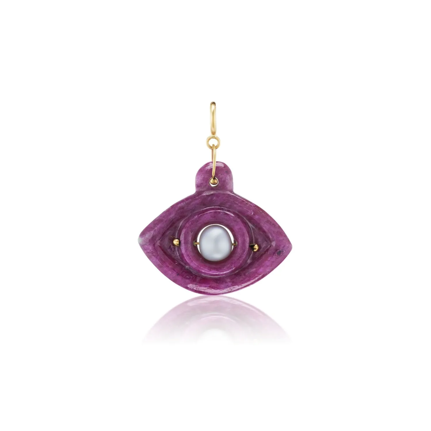 Ten Thousand Things hand-carved evil eye charm in Ruby with a suspended Tahitian Pearl center bead. Available exclusively in-store and online at MUSExMUSE.