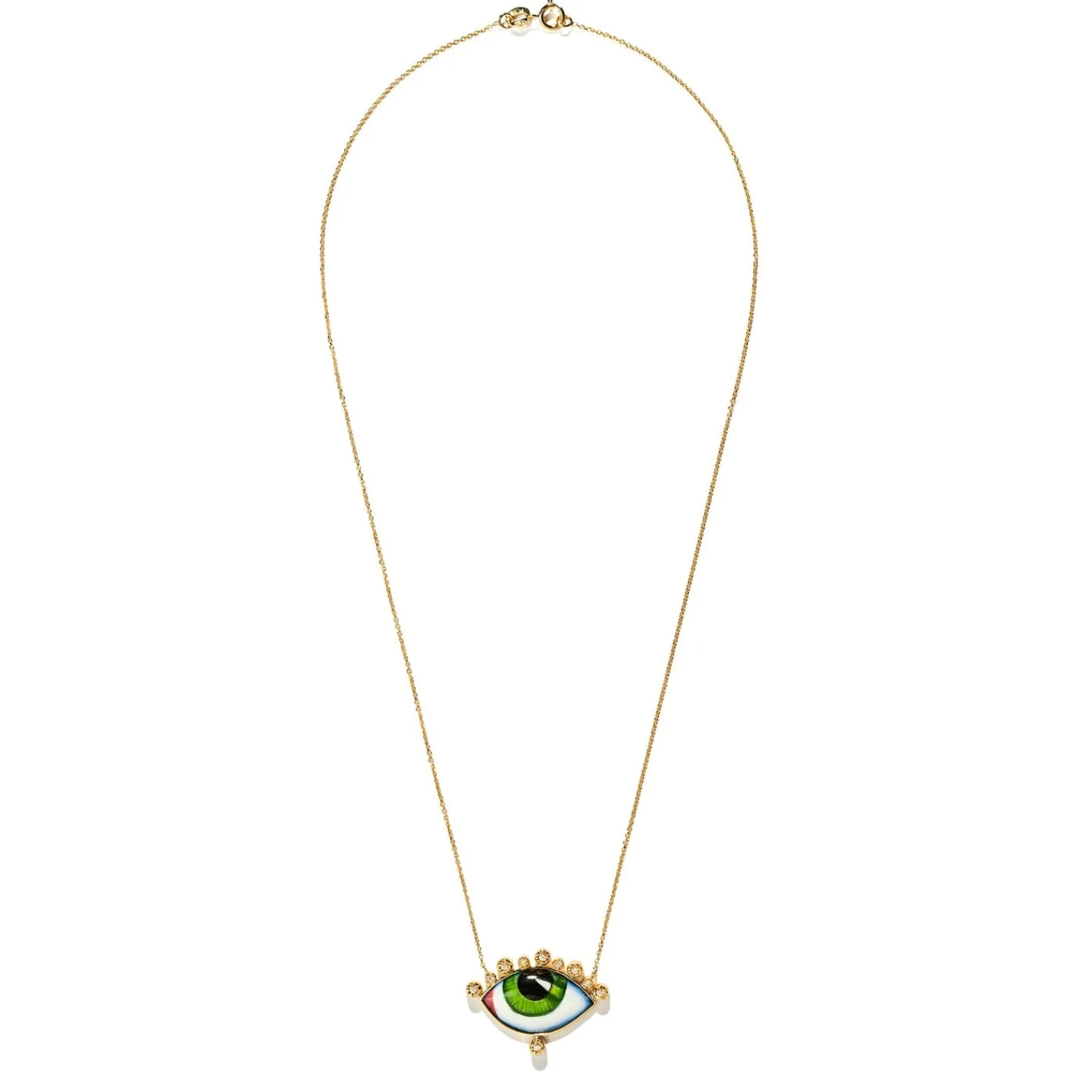 Lito Russe Grand Vert necklace with large green enameled eye and brilliant cut white diamonds.