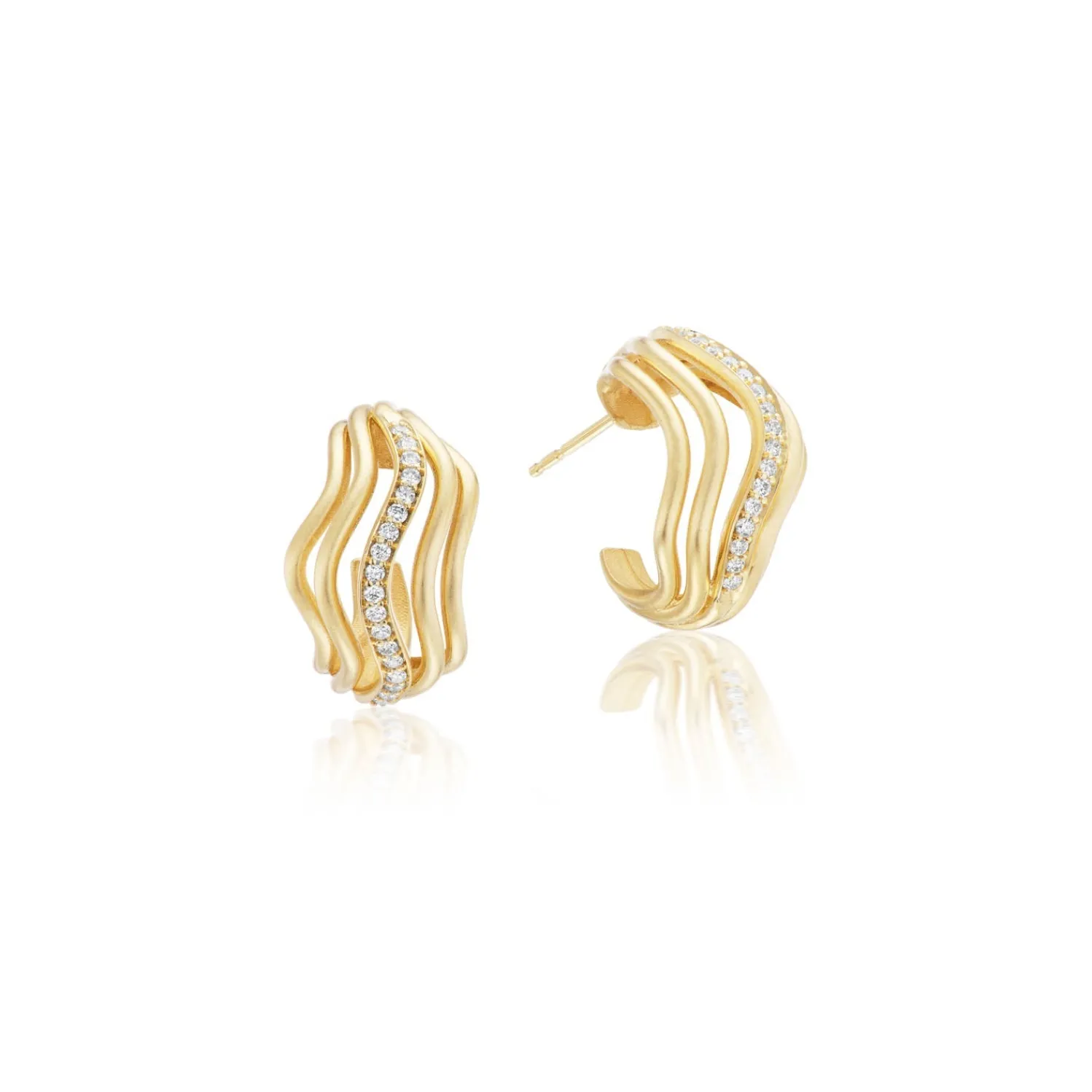 Pave set diamonds along satin finish curving 18k yellow gold.