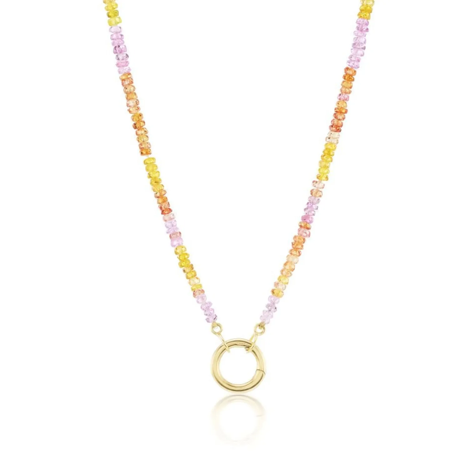 Natural multi-colored sapphire beaded necklace with yellow gold circle clasp perfect for charms.