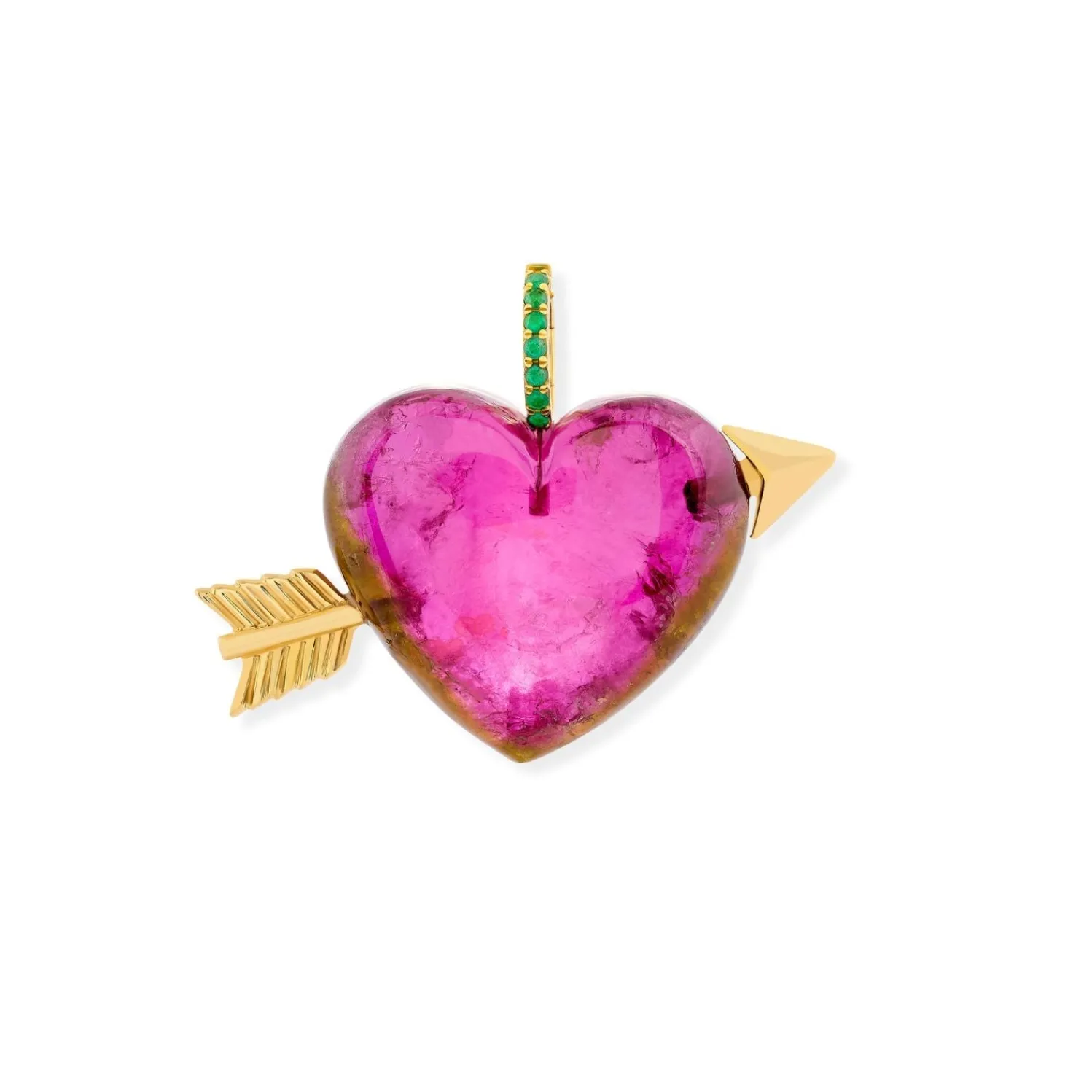Violette Joaillerie Handcarved Pink Tourmaline and Pave Emerald Heart pendant.