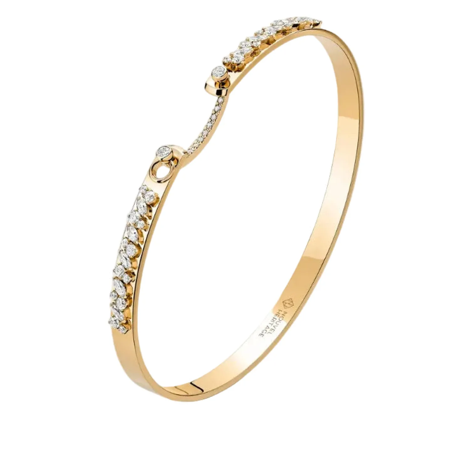 Nouvelle Heritage Under the Stars Bangle bracelet in yellow gold with marquise cut white diamonds. Pave white diamonds on latch.