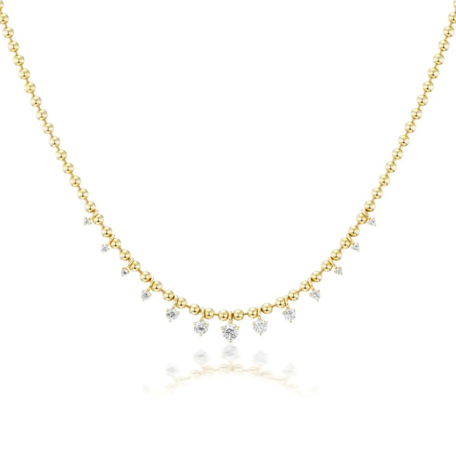 VICE VERSA Graduated White Diamond Mini Kin Necklace in Yellow Gold. Featuring Free-floating White Diamonds Suspended from a Yellow Gold Ball Chain at the Front. An Updated Version of the Classic Tennis Necklace.