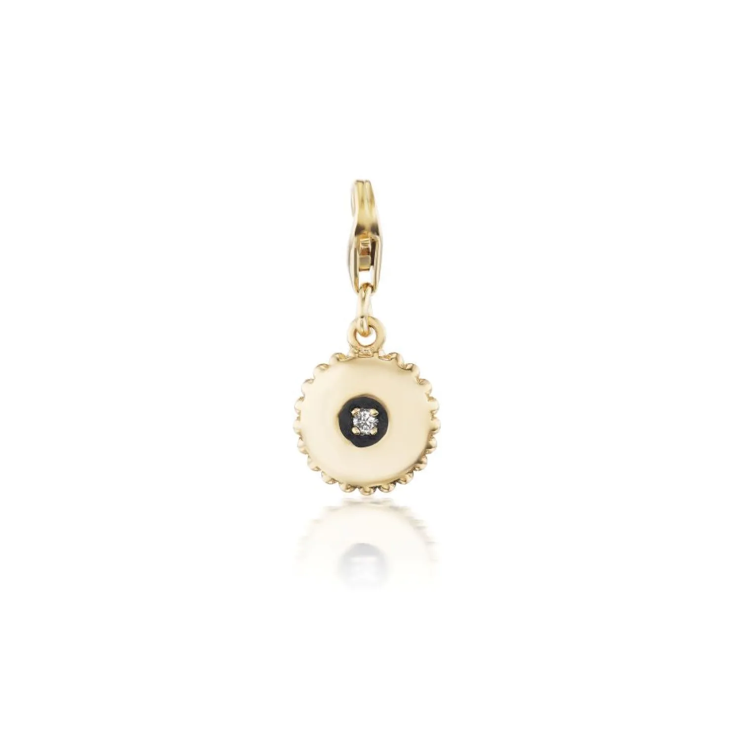 Nancy Newberg Yellow gold circle charm with scalloped edge and white diamond at center. Black Rhodium plating around diamond adds a nice contrast. Lobster clasp at top so the charm can affix to most chains.