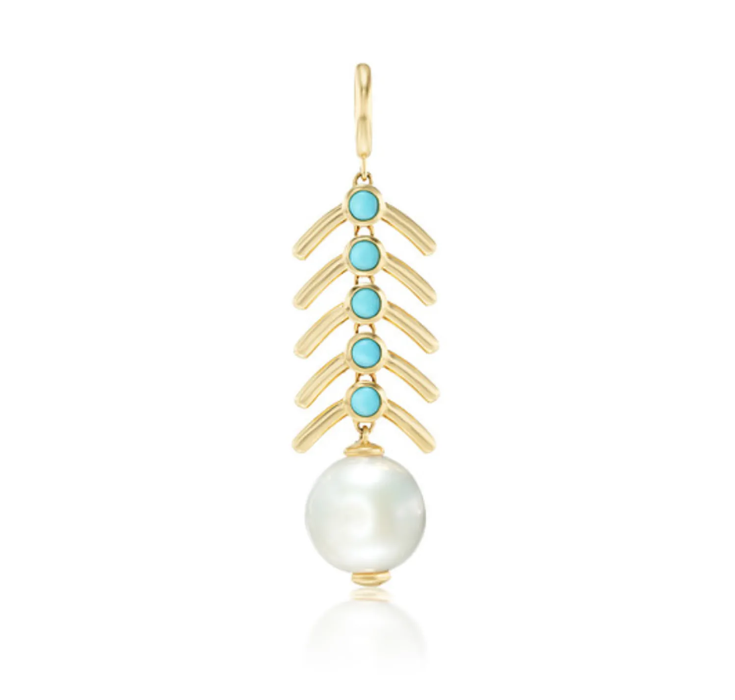 BECK White Freshwater Pearl and Turquoise Piska Charm in Yellow Gold. Feather-like design.