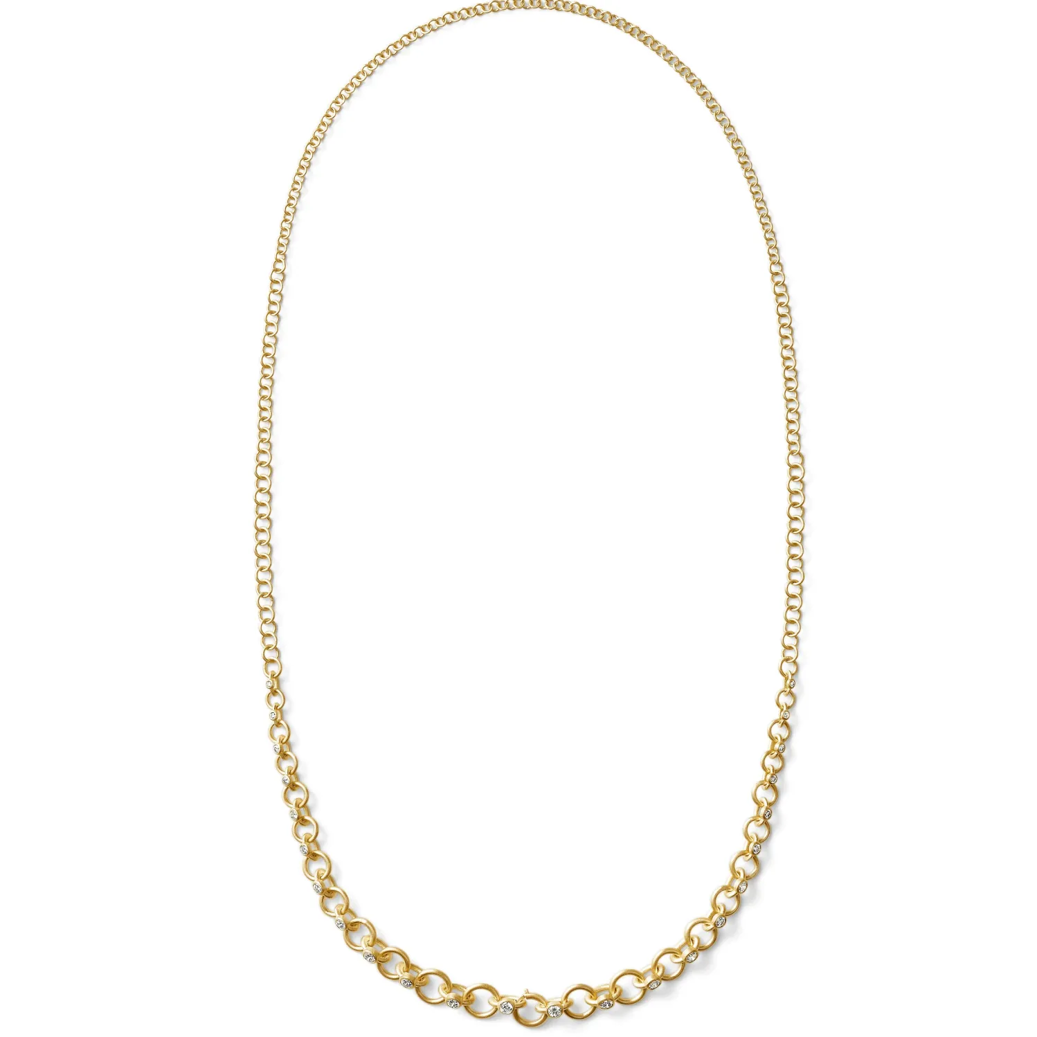 SHIHARA Graduated Chain Necklace Featuring Circular Links Alternating with Spacer Links set with White Diamonds at the Front of the Necklace. Secured with a Concealed Spring-ring Clasp