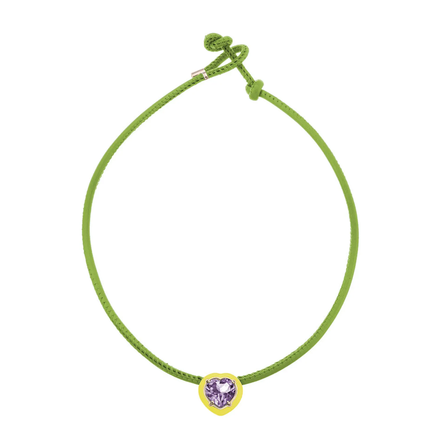Bea Bongiasca green adjustable length leather cord choker with heart cut amethyst in a yellow enamel setting with a knot-loop closure.