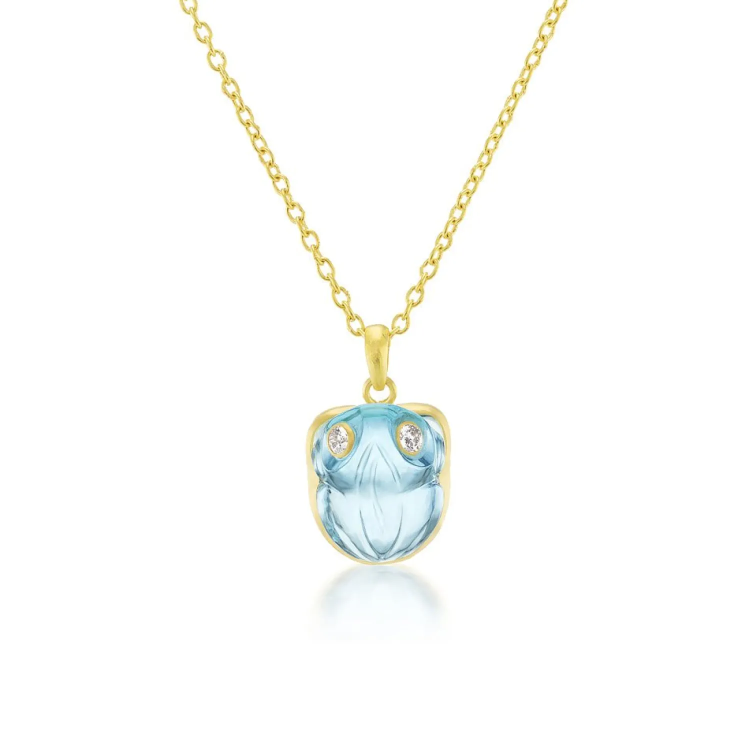 Munnu Carved Aquamarine Frog Pendant with White Diamond Eyes on an Adjustable Length Yellow Gold Chain.