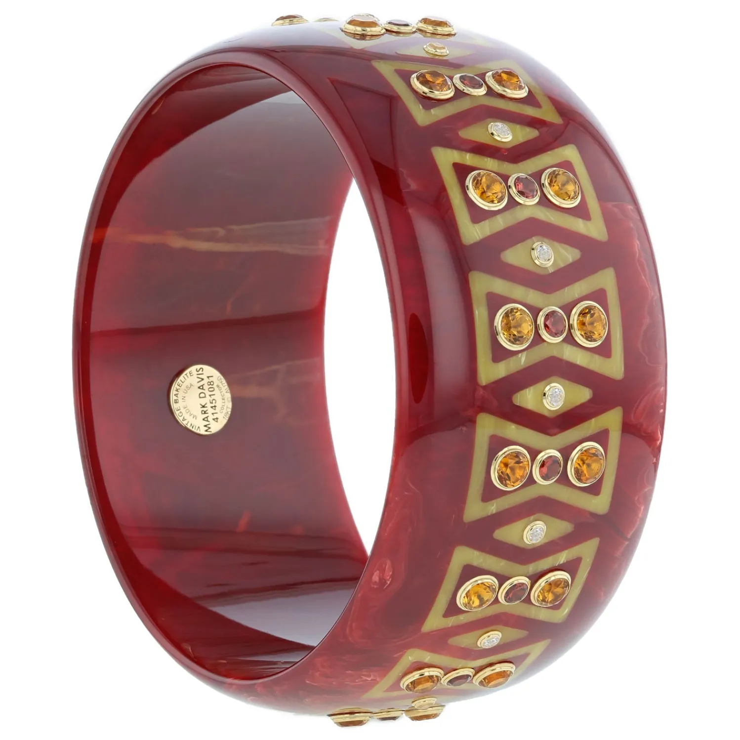 Mark Davis Vintage Bakelite Bangle with Bowtie-Shaped Inlay Detailing, Citrine, Mozambique Garnet and White Topaz set in Yellow Gold. Each Mark Davis Piece is One-of-a-Kind and Sustainably Produced in South Carolina.